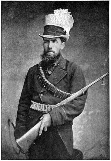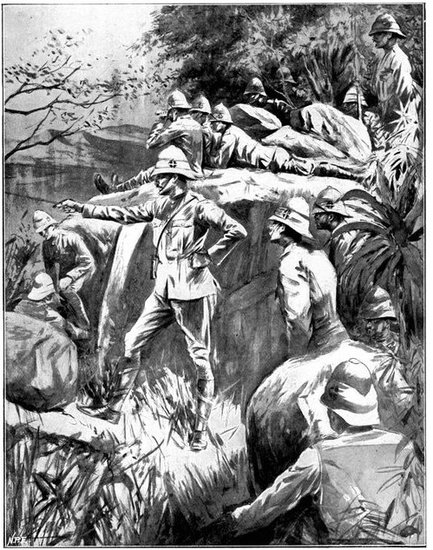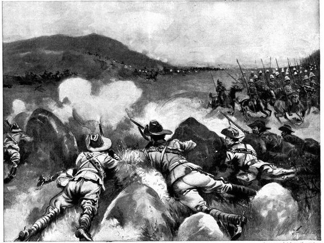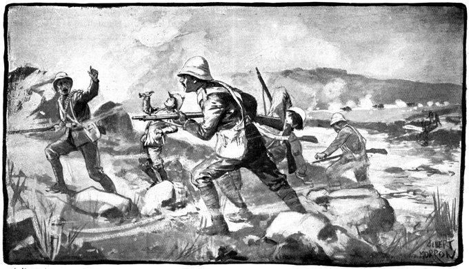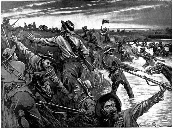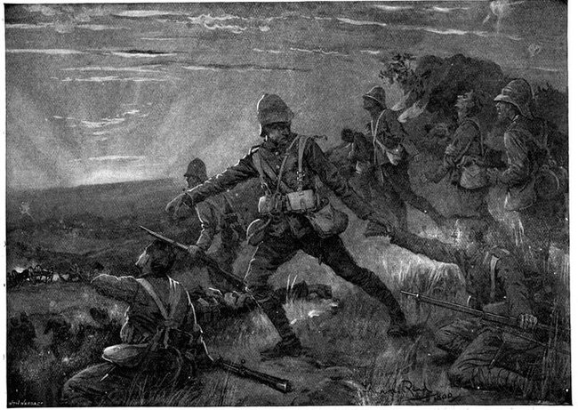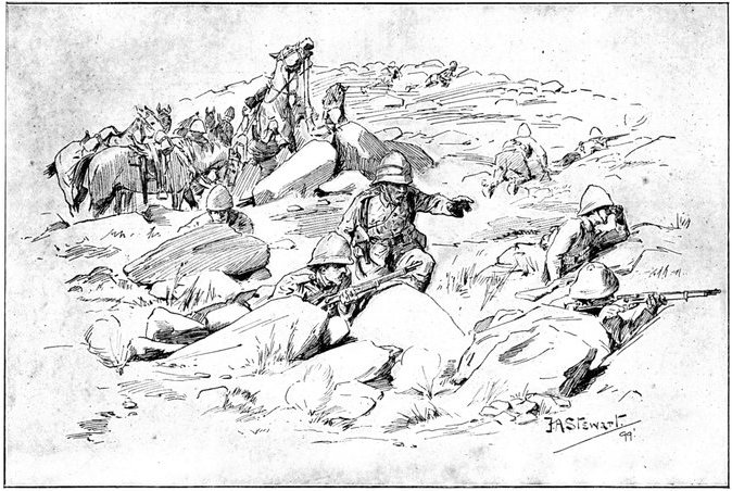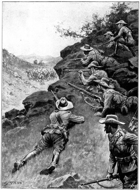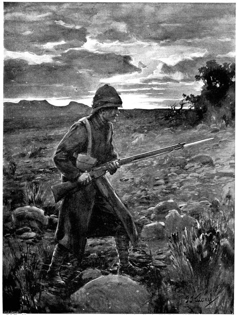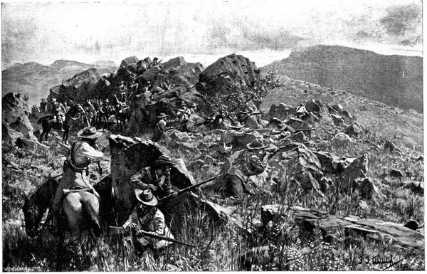 So far General French himself had not been in touch with the enemy. But on the morning of the 12th, when his troops saddled up and started on a short seven miles ride to Waterval Drift upon the Riet, it was clear that the Boers were approaching. They were the same party that had been engaged by Colonel Hannay on the previous day, reinforced[Pg 349] by 400 men from Magersfontein. The start was made at 3 a.m., yet though Rimington's famous scouts, who knew every inch of the ground, were guiding, the darkness just before dawn was such that a halt became imperative, and the general's intention of seizing the drift before clear day broke was frustrated. As the red light of early dawn showed over the kopjes to the east, the march was resumed, and about 6 a.m. a few shots were fired upon the British left flank when the column neared the drift, and a gun galloped out into the open and began a rapid and well-directed fire upon the British troops. General French found that a kopje in his immediate front was strongly held. What was to be done?