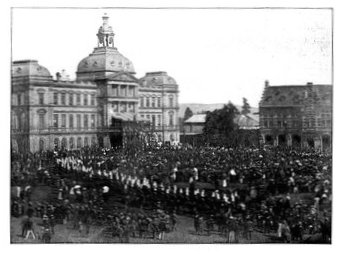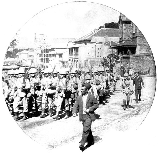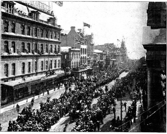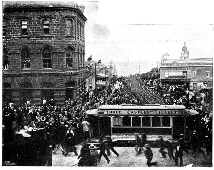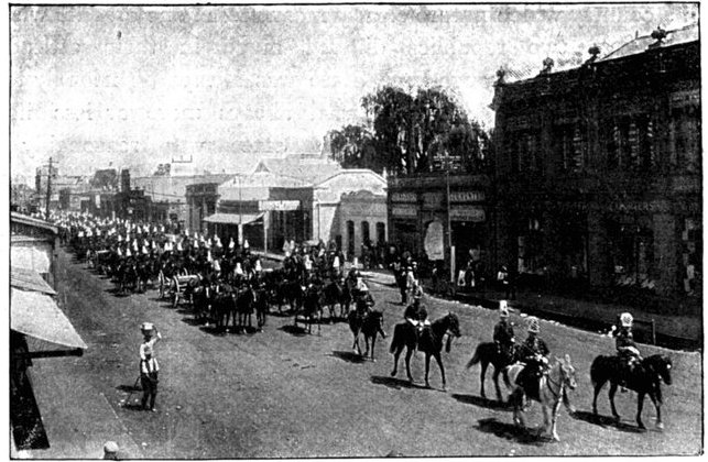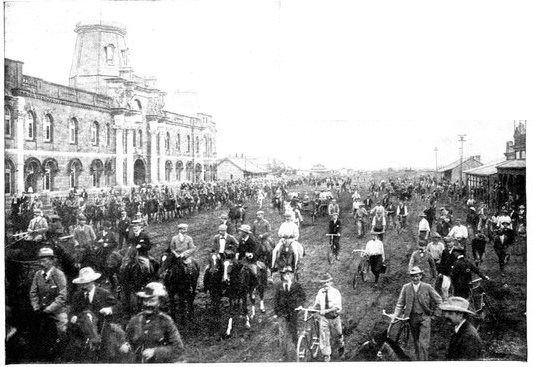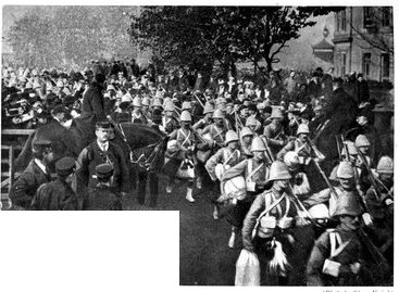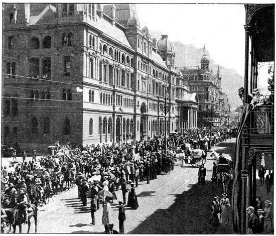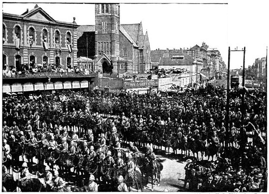 RECEPTION OF THE 16th LANCERS, CAPE TOWN.The 16th Lancers, who did such excellent work on February 15, were dispatched from India to South Africa on the application of Lord Roberts. On their arrival at Cape Town a request was made that the regiment should march through the town. The request was granted, and the fine regiment, whose list of battle honours is surpassed by no other cavalry regiment, and equalled only by one, was received with the wildest enthusiasm.