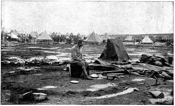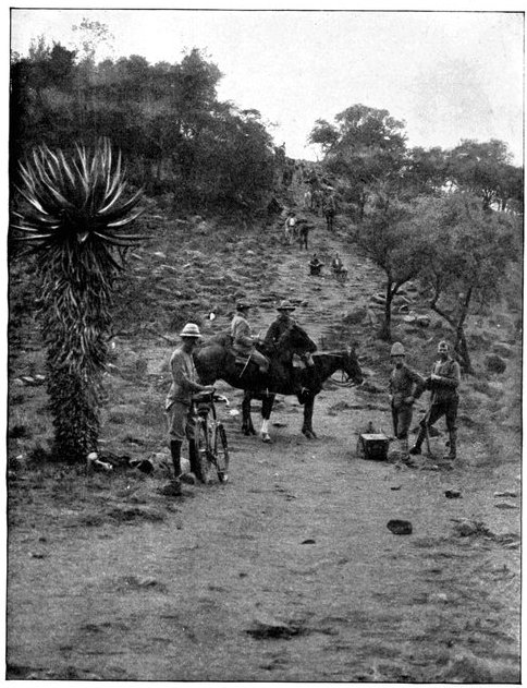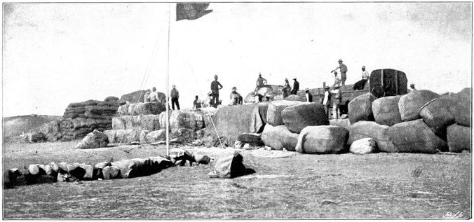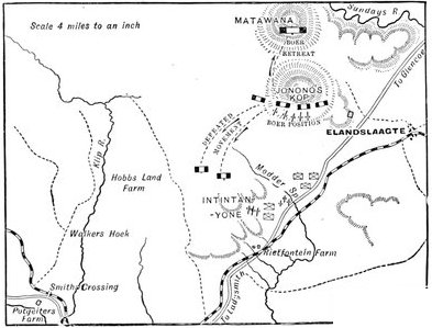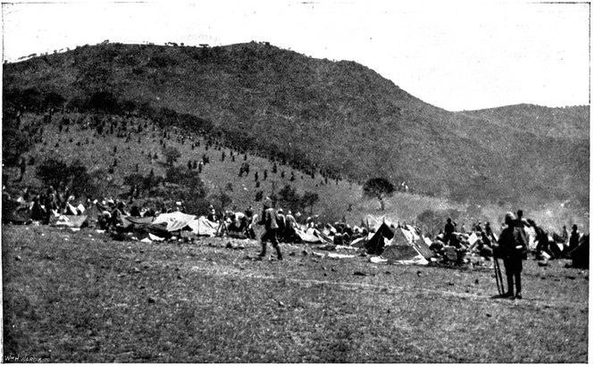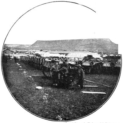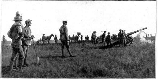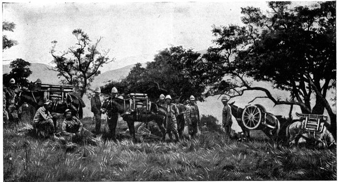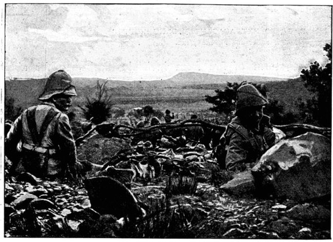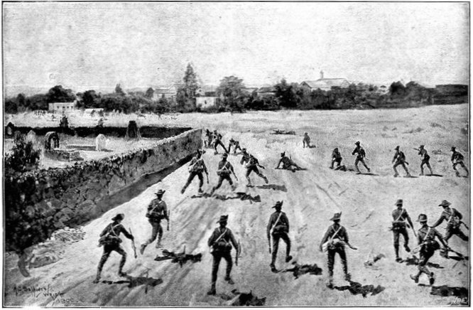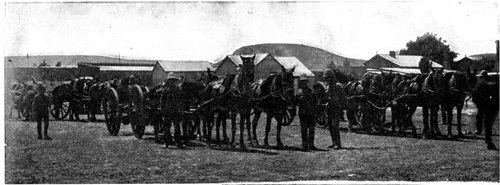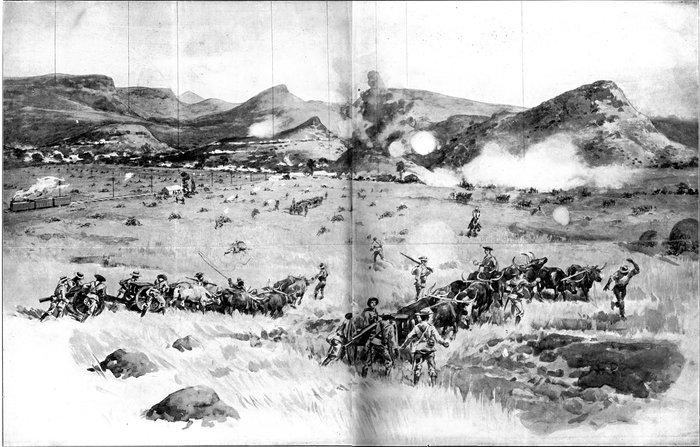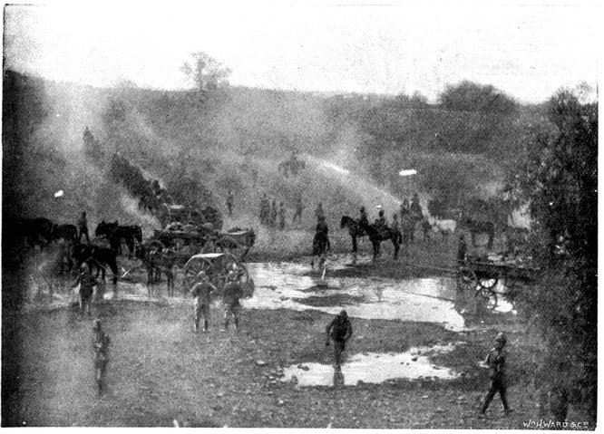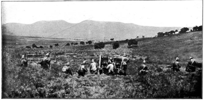 The British losses in this dashing movement were ridiculously small. Less than a dozen men were killed or wounded. At a deserted farm an excellent well was discovered, and the men were able to quench their thirst; unhappily there was nothing for the horses, which were much exhausted. The night of the 14th-15th had been marked by one of those tropical downpours, so common in the rainy season, and the surface of the veldt was in consequence slushy and wet, trying the artillery and cavalry horses more than ever.