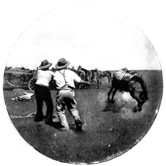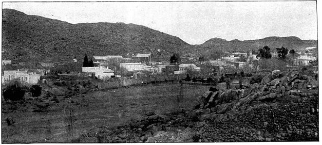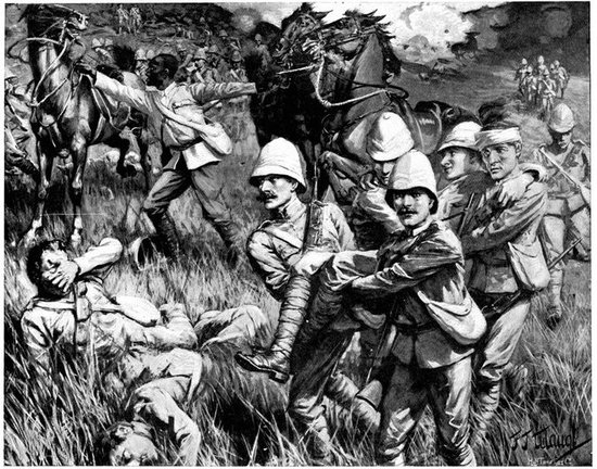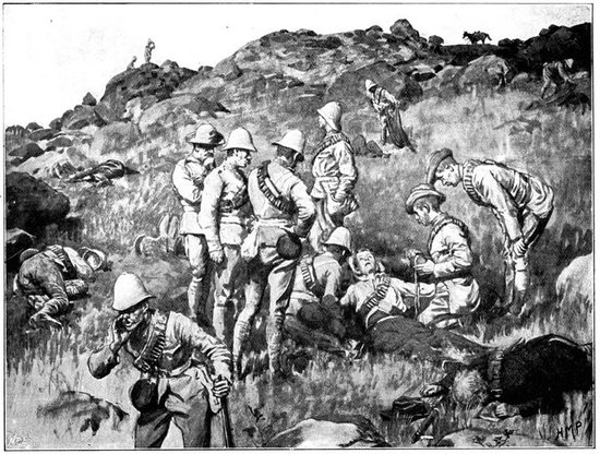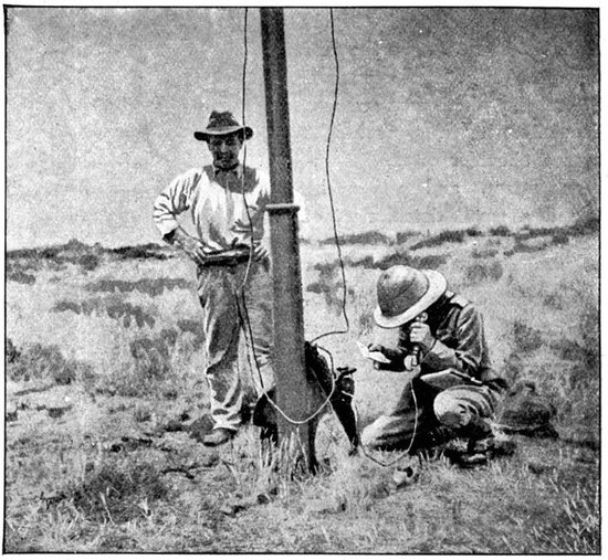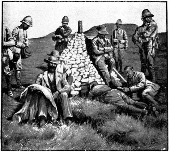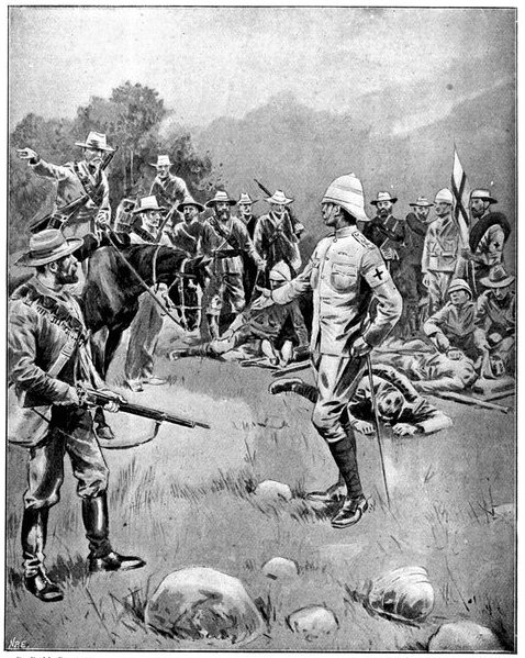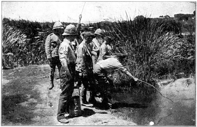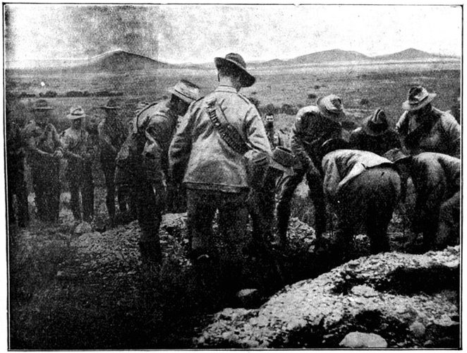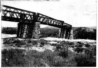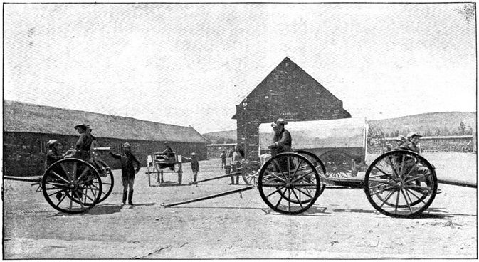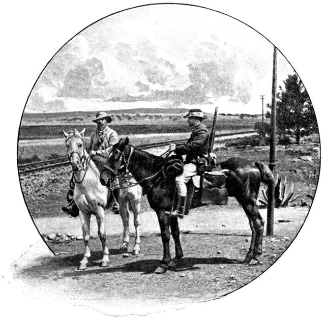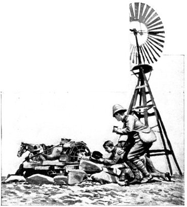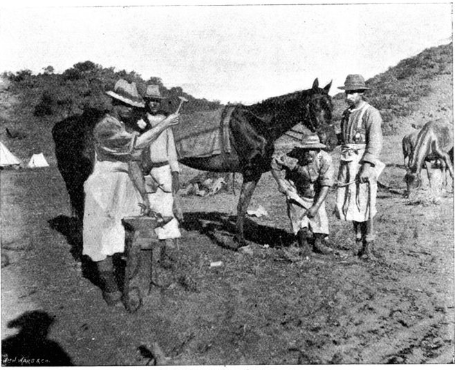 The British losses in this dashing movement were ridiculously small. Less than a dozen men were killed or wounded. At a deserted farm an excellent well was discovered, and the men were able to quench their thirst; unhappily there was nothing for the horses, which were much exhausted. The night of the 14th-15th had been marked by one of those tropical downpours, so common in the rainy season, and the surface of the veldt was in consequence slushy and wet, trying the artillery and cavalry horses more than ever.