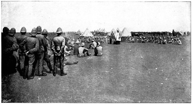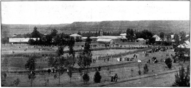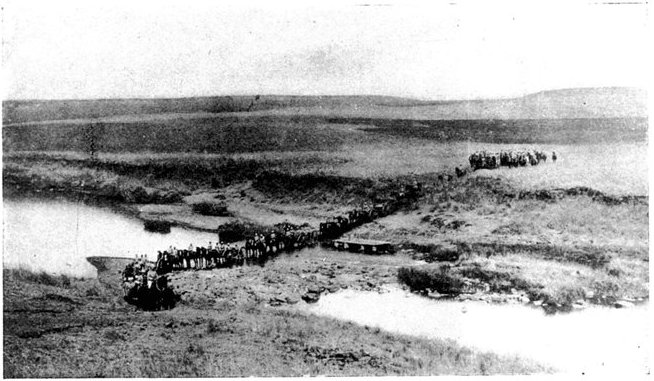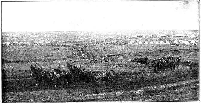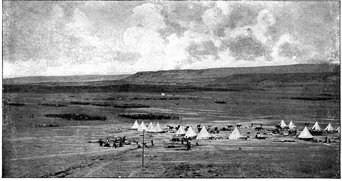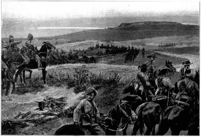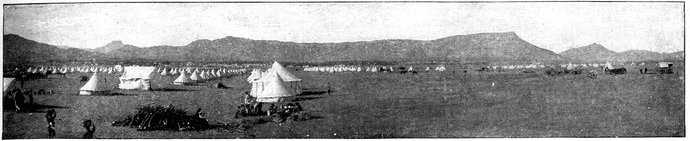 Punctually at 3 a.m. of the 11th, the day of prayer and intercession for success in England, General French led out his cavalry regiments and his horse artillery in magnificent procession—the last seven batteries or 42 guns strong. The night had not yet given way to dawn, when he struck due south from Modder River Camp, leaving his tents standing to deceive the enemy. The spectacle was a very fine one. "Out of the moonlit dust," writes an officer, "one could discern a squadron of Lancers trotting up into position, the lances standing out against the sky-line, the heads and shoulders of the men being just visible, while the lower portion of their bodies and the horses faded into obscurity. Then there would come with a heavy rumble a battery of artillery, similarly vignetted in the moonlit dust, or, perhaps, an ambulance section, with its red cross, or a battalion of mounted infantry, while hoarse, short words of command caught the ear on all sides." The troopers marched light with only their arms, the clothes they wore, and five days' rations. In the darkness the horses stumbled often over the holes of the ant-bears. Now and then a cavalryman would come heavily to earth; at times a half-dozen of men and horses would be floundering in one confused heap, and the cry was heard on every side—"Hole here!" "Hole to the right!" The horses were for the most part in bad[Pg 348] condition. They had not recovered from the long sea voyage before they were put to the hardest of work in an unfamiliar climate. The mounted infantry men, too, were not skilled in the art of sparing and saving their horses. The move in the fierce heat to Koodoesrand Drift, at General Macdonald's demand, had put a great strain upon one of the cavalry brigades, from which it had not entirely recovered. And so, as in the twilight the dust-shrouded column swept down towards Ramdam, twenty miles away, some of the horses already began to show signs of weakness. The railway was followed as far as Graspan, so as to afford not the slightest indication of the division's object. Then turning east, Ramdam was struck about mid-day. The place which bulks so large upon the map was merely a farmhouse with one or two hovels near, a well, and a "pan" or large pond of water, dry except during the rains. The thirsty men crowded round the well; the horses were taken down to the pan, for the day had been one of broiling heat. Here Colonel Hannay's men fell into the column, reporting a loss of 39 killed, wounded, or missing; here, too, drafts and details from the base joined up, swelling the gathering of cavalry; and here presently, as night came on, long columns of infantry of the Sixth Division began to arrive. Far off on every side to the west rose clouds of dust, marking the advance of a great army. Three divisions were upon the move, besides the cavalry. First came the Sixth, then the Seventh, and last the Ninth Division, each a day apart, heading steadily for Ramdam and the Riet.