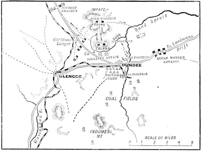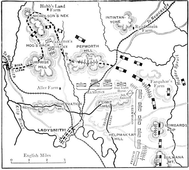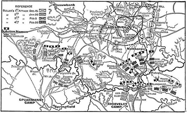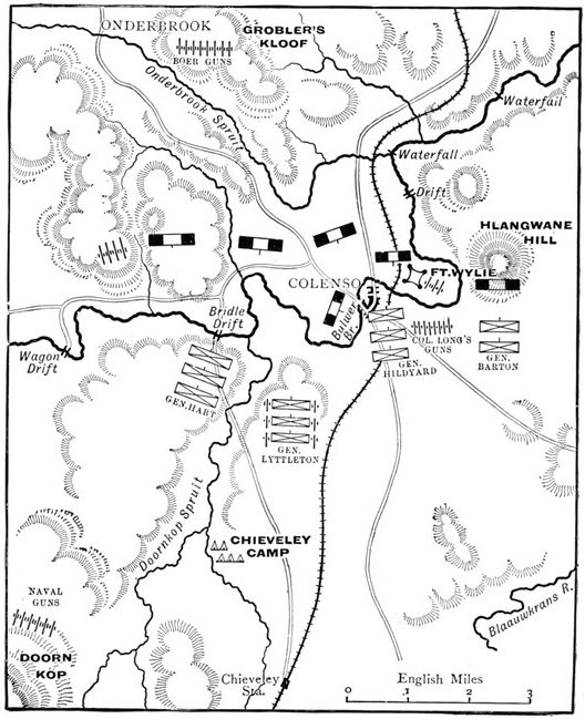 | The battle begins—Bombardment of Fort Wylie—Artillery pushed forward—The Boers open fire—The guns abandoned—General Hart's position—The Dublin Fusiliers attempt to ford the Tugela—Their retirement ordered—Failure to carry Hlangwane—Advance of Hildyard's Brigade—General withdrawal ordered—Death of Lieutenant Roberts—Guns and men captured by the Boers—Retirement effected in good order—Our losses—Scarcity of water—Bravery of the Army Medical Corps—Impressions of an eye-witness—Armistice—A day of blunders | 90-109 |