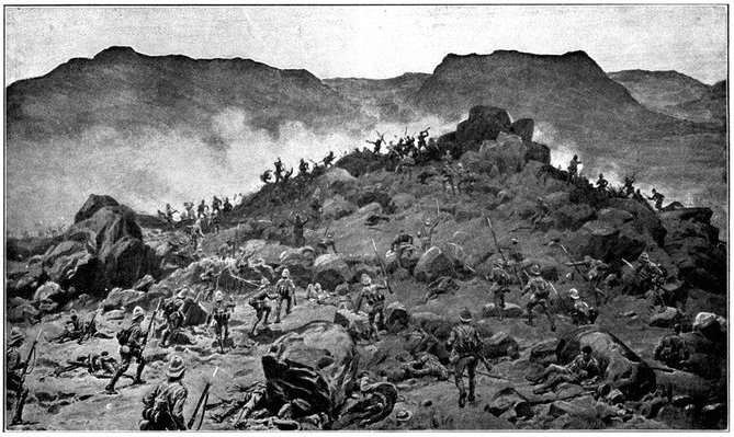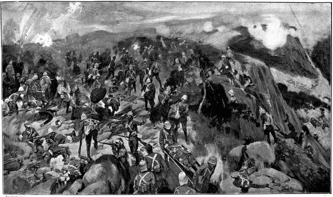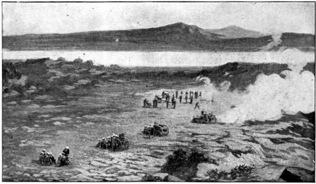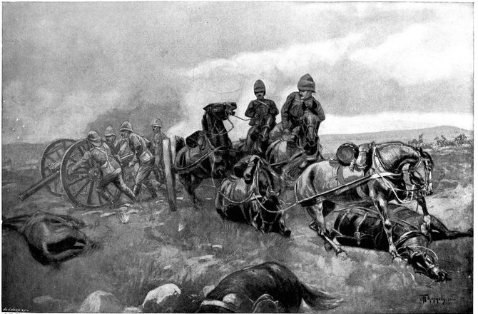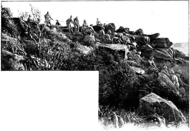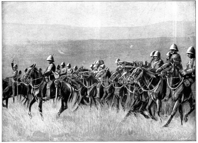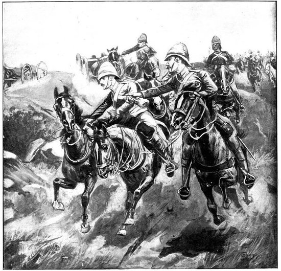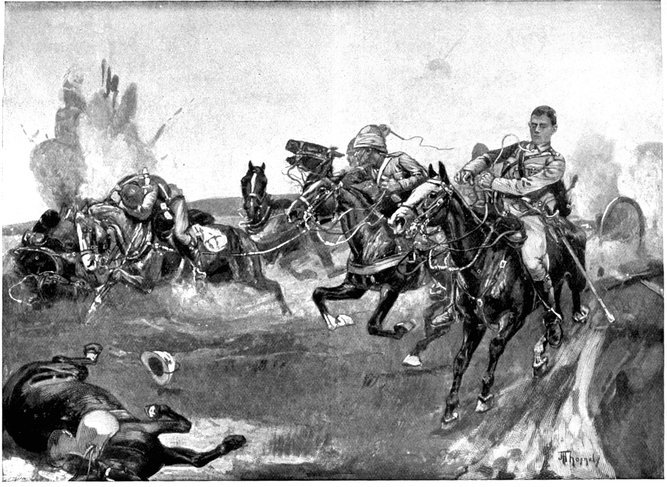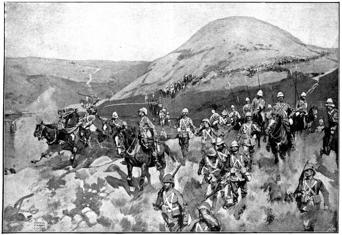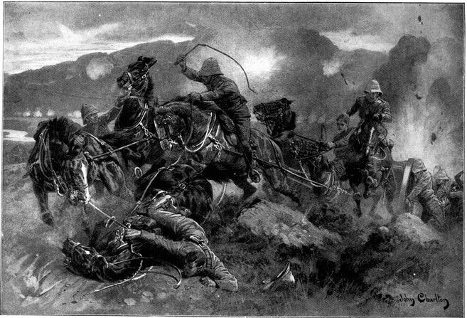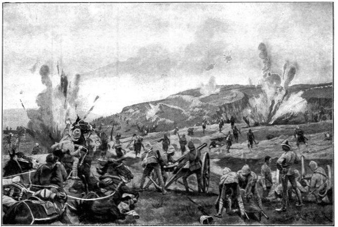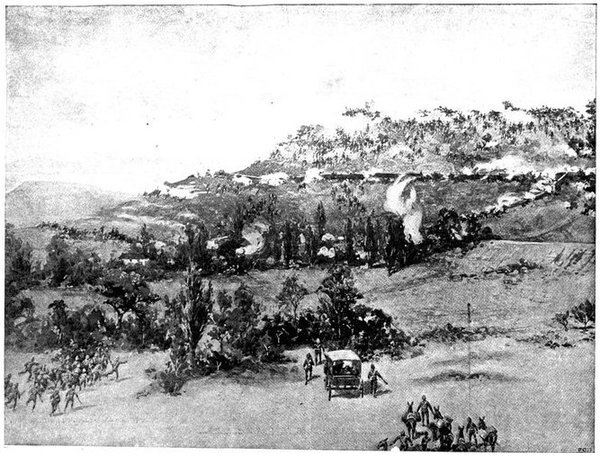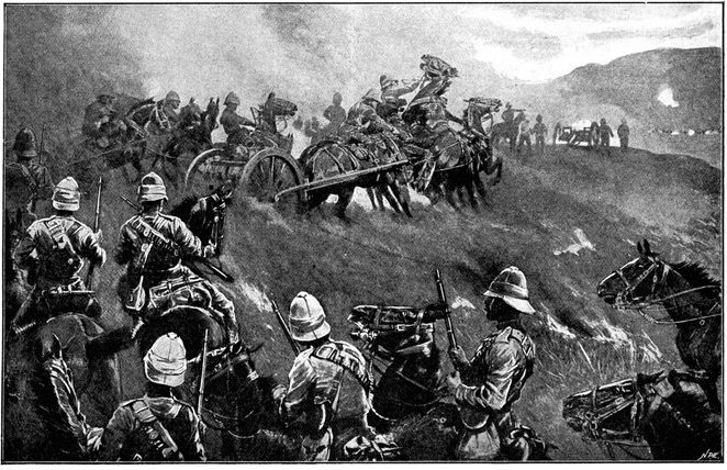 On the morning of the 15th Lord Kitchener and General Kelly-Kenny rode round the cavalry camps. The field batteries and two naval guns replaced and set free the Horse Artillery. One of the naval 12-pounders was stationed upon a kopje overlooking the drift, after an incident which well illustrated the resourcefulness of our bluejackets. "On moving the gun," says a correspondent, "one of the wheels collapsed; but the sailors lifted the gun from its carriage, and hauled it a distance of two miles to the top of the kopje. It was a great performance, and well deserved the thanks which Lord Kitchener conveyed to them." The tired infantry went on outpost duty instead of the cavalrymen, and after breakfast the three cavalry brigades and the seven horse batteries drew up and moved out with definite orders to reach Kimberley that night. The sight, as the endless line of cavalry rode off across the veldt, about 9 a.m., was a very fine one. On the left was Broadwood with his Hussars, Lancers, and heavy Household Cavalry; in the centre was General Porter, just arrived, with his Dragoons; on the left Gordon with the Lancers' gay pennons and the more sombre squadrons of Roberts' Horse. Scarcely had the line left the river—heading[Pg 356] directly to the east with the object of deceiving the enemy, and leading them to suppose that the object of the ride was Bloemfontein rather than Kimberley—when a Boer gun opened fire on the British left, sending several shells among the cavalry. At once two batteries of Horse Artillery went rattling to the front, deployed, and returned the fire. The three field batteries from Klip Drift also pushed out to support General French. The Horse Artillery suffered considerable loss, thirteen officers and men being killed or wounded. The cavalry extended to the right, when from kopjes on the left front as well as the left flank and left rear came a heavy fire from what was evidently a large force of Boers; on the right front upon a kopje the enemy also showed in some strength. It was now that General French had an opportunity to show his skill and generalship. Without any hesitation he gave General Gordon orders to charge with his men and clear a nek between the kopjes. The nek was about 2,500 yards wide, smooth, and level. At the same time the Horse Artillery was ordered to scourge the kopjes with shrapnel.