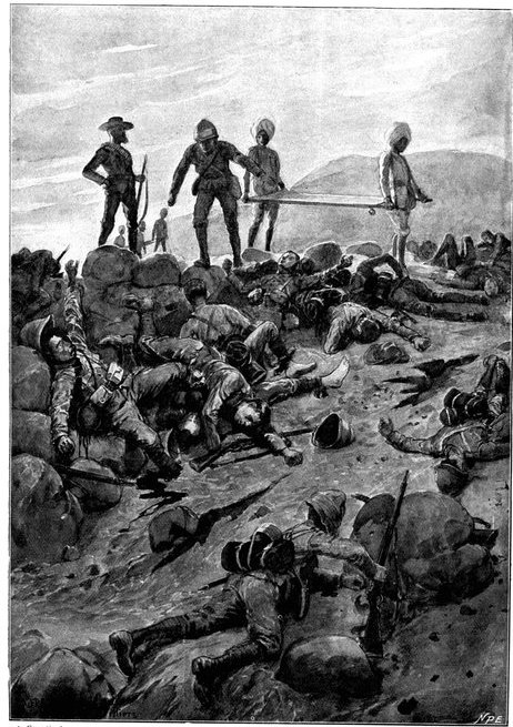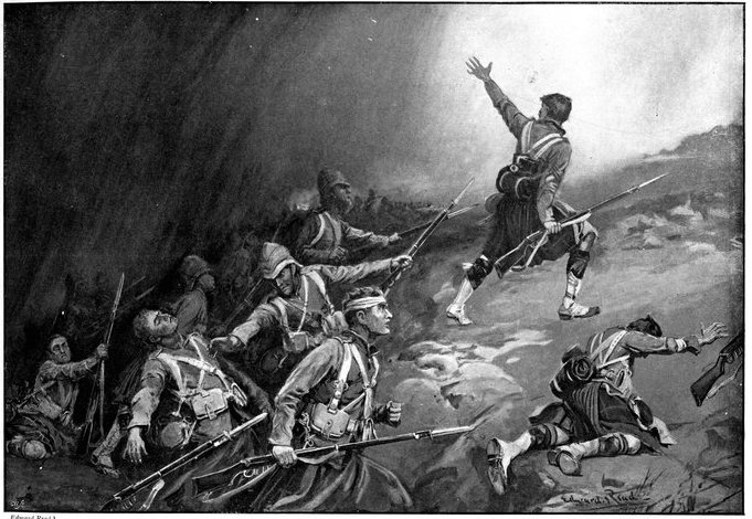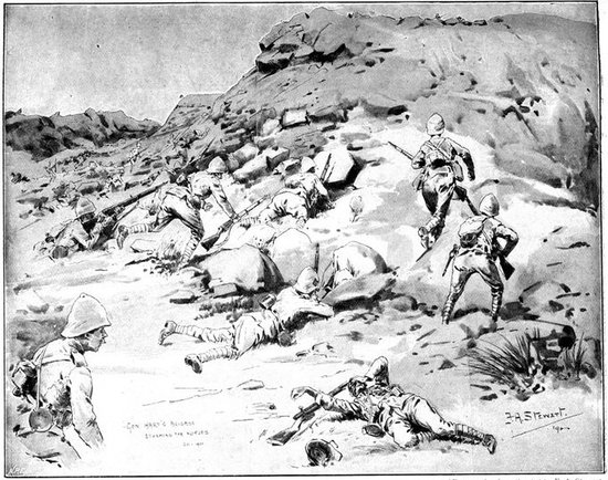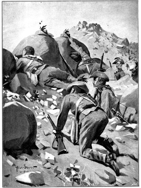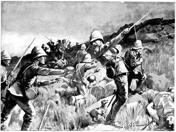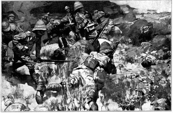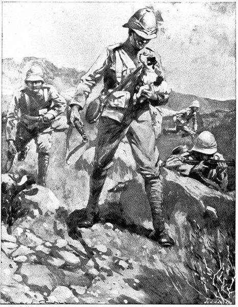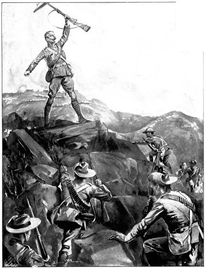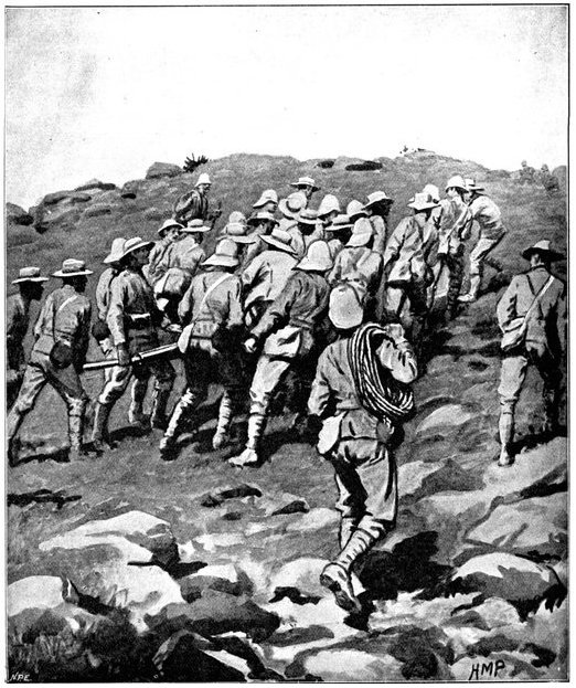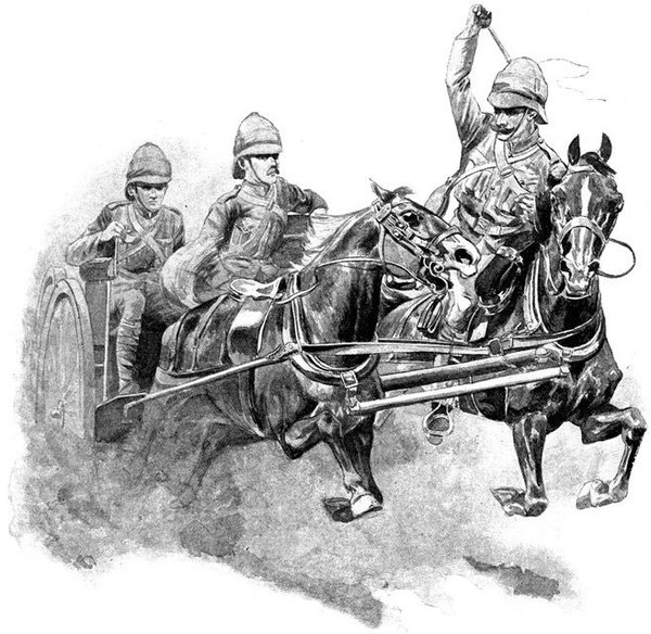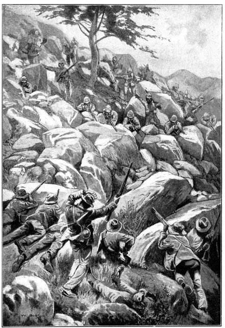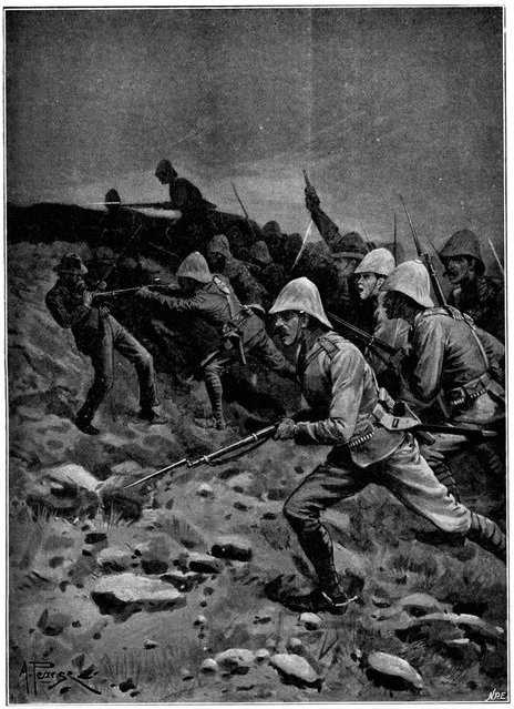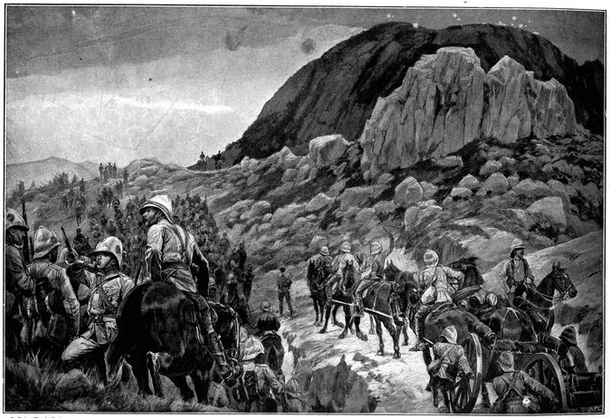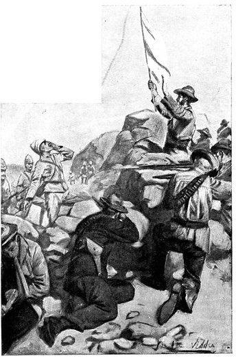 On the morning of the 15th Lord Kitchener and General Kelly-Kenny rode round the cavalry camps. The field batteries and two naval guns replaced and set free the Horse Artillery. One of the naval 12-pounders was stationed upon a kopje overlooking the drift, after an incident which well illustrated the resourcefulness of our bluejackets. "On moving the gun," says a correspondent, "one of the wheels collapsed; but the sailors lifted the gun from its carriage, and hauled it a distance of two miles to the top of the kopje. It was a great performance, and well deserved the thanks which Lord Kitchener conveyed to them." The tired infantry went on outpost duty instead of the cavalrymen, and after breakfast the three cavalry brigades and the seven horse batteries drew up and moved out with definite orders to reach Kimberley that night. The sight, as the endless line of cavalry rode off across the veldt, about 9 a.m., was a very fine one. On the left was Broadwood with his Hussars, Lancers, and heavy Household Cavalry; in the centre was General Porter, just arrived, with his Dragoons; on the left Gordon with the Lancers' gay pennons and the more sombre squadrons of Roberts' Horse. Scarcely had the line left the river—heading[Pg 356] directly to the east with the object of deceiving the enemy, and leading them to suppose that the object of the ride was Bloemfontein rather than Kimberley—when a Boer gun opened fire on the British left, sending several shells among the cavalry. At once two batteries of Horse Artillery went rattling to the front, deployed, and returned the fire. The three field batteries from Klip Drift also pushed out to support General French. The Horse Artillery suffered considerable loss, thirteen officers and men being killed or wounded. The cavalry extended to the right, when from kopjes on the left front as well as the left flank and left rear came a heavy fire from what was evidently a large force of Boers; on the right front upon a kopje the enemy also showed in some strength. It was now that General French had an opportunity to show his skill and generalship. Without any hesitation he gave General Gordon orders to charge with his men and clear a nek between the kopjes. The nek was about 2,500 yards wide, smooth, and level. At the same time the Horse Artillery was ordered to scourge the kopjes with shrapnel.