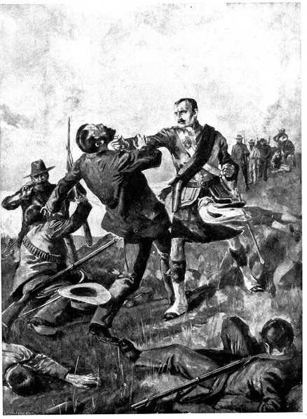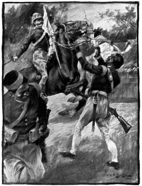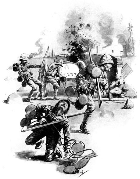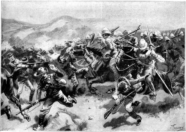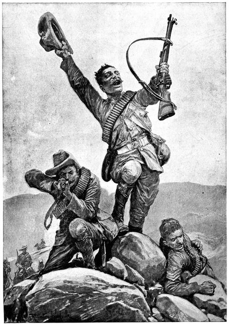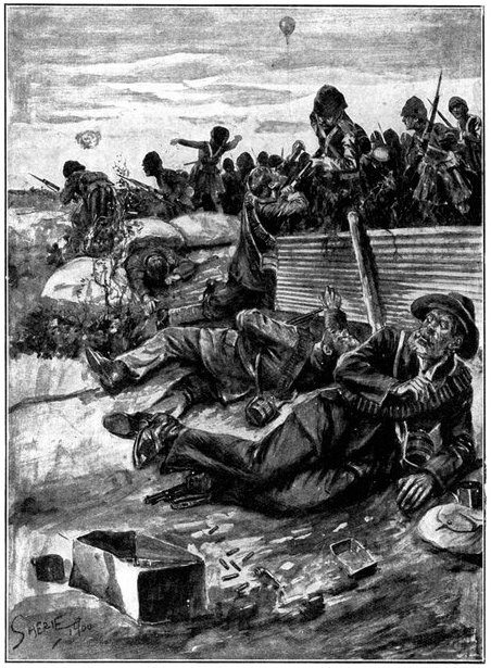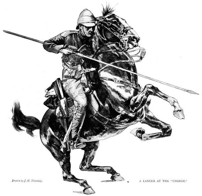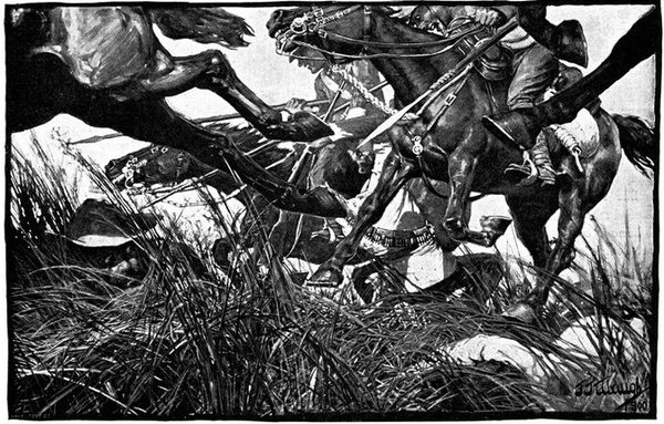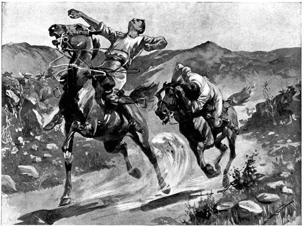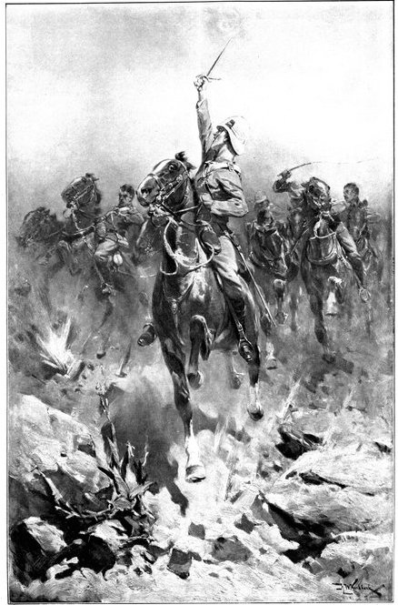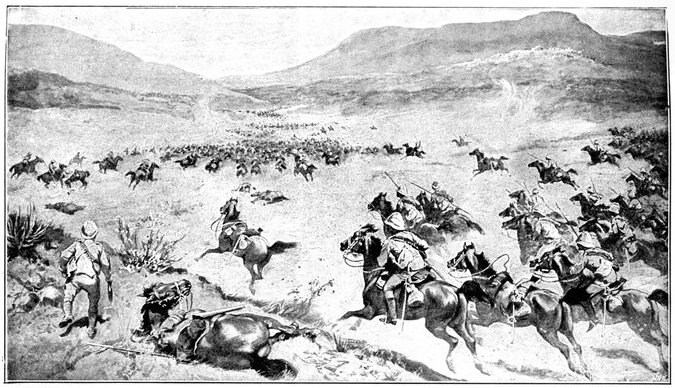 A CHARGE OF LANCERS, FROM THE BOER POINT OF VIEW.And now, about 3·30 p.m., as a ridge was breasted, far away over the plain the tall chimneys and mine gear of Kimberley came into sight. The column broke into a tumult of cheering. On the extreme left could be seen the kopjes of Magersfontein; over the veldt sounded the heavy booming of guns, and from time to time the puffs of smoke from bursting shells showed that an artillery fight was in progress. Broadwood moved off to the left with orders to demonstrate to the enemy that the British cavalry were behind them. General French, with the heliographers, climbed a small kopje on the right and set to work to open communication with the besieged garrison. For long his heliograph winked and flashed without attracting any notice, and all grew impatient. Then at last came an answering flash. But the garrison took General French's division for a force of Boers, and replied to his anxious signals with chaff, such as the signallers of the two opposed armies often exchanged. They lavished upon him a great deal of fictitious detail, until presently it dawned upon them that the British cavalry were in truth approaching. Then at last they informed General French that they had captured Alexandersfontein, a point seven miles from Kimberley and only five miles from the cavalry, and that the direction by which he was advancing was the best. Already, far away, the note of cheering came over the veldt. The British troops holding Alexandersfontein were rejoicing at the coming of their comrades.