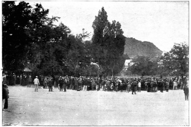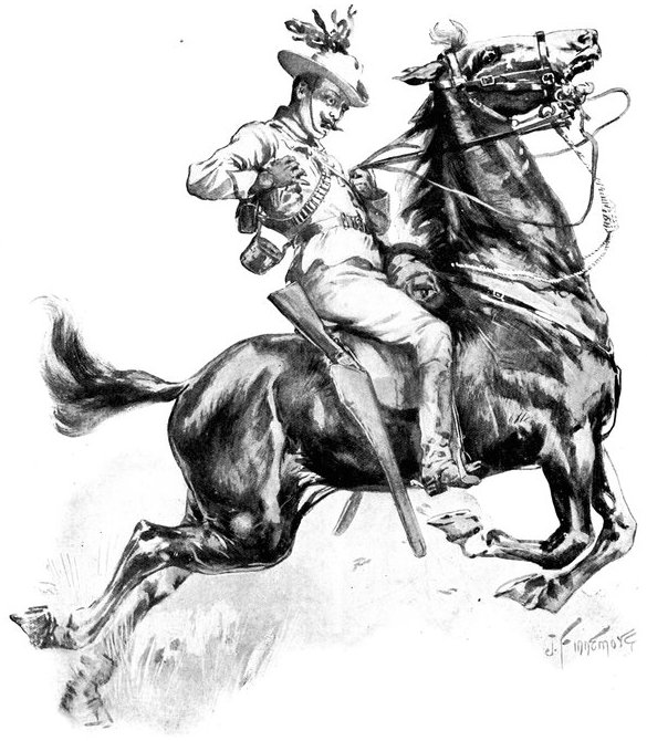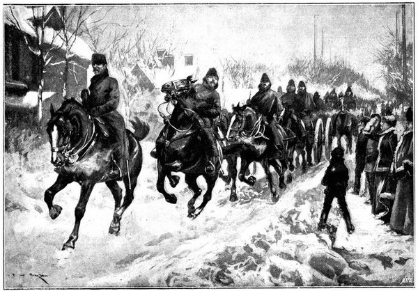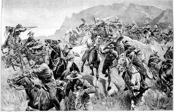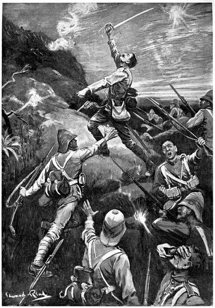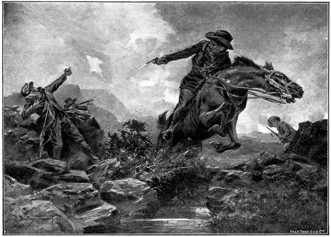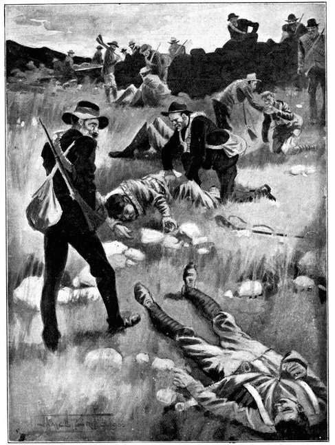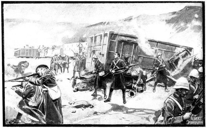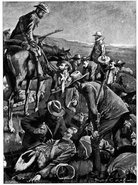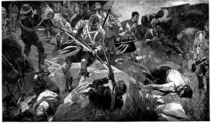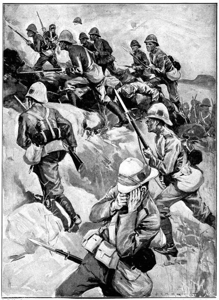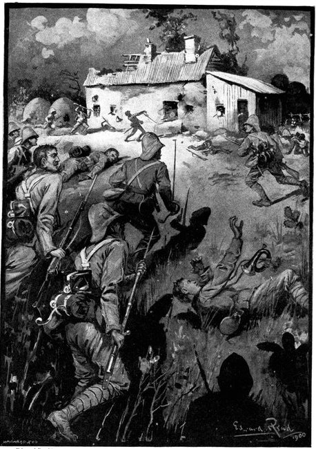A CHARGE OF LANCERS, FROM THE BOER POINT OF VIEW.And now, about 3·30 p.m., as a ridge was breasted, far away over the plain the tall chimneys and mine gear of Kimberley came into sight. The column broke into a tumult of cheering. On the extreme left could be seen the kopjes of Magersfontein; over the veldt sounded the heavy booming of guns, and from time to time the puffs of smoke from bursting shells showed that an artillery fight was in progress. Broadwood moved off to the left with orders to demonstrate to the enemy that the British cavalry were behind them. General French, with the heliographers, climbed a small kopje on the right and set to work to open communication with the besieged garrison. For long his heliograph winked and flashed without attracting any notice, and all grew impatient. Then at last came an answering flash. But the garrison took General French's division for a force of Boers, and replied to his anxious signals with chaff, such as the signallers of the two opposed armies often exchanged. They lavished upon him a great deal of fictitious detail, until presently it dawned upon them that the British cavalry were in truth approaching. Then at last they informed General French that they had captured Alexandersfontein, a point seven miles from Kimberley and only five miles from the cavalry, and that the direction by which he was advancing was the best. Already, far away, the note of cheering came over the veldt. The British troops holding Alexandersfontein were rejoicing at the coming of their comrades.