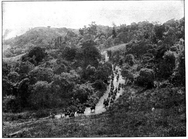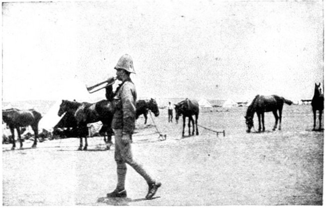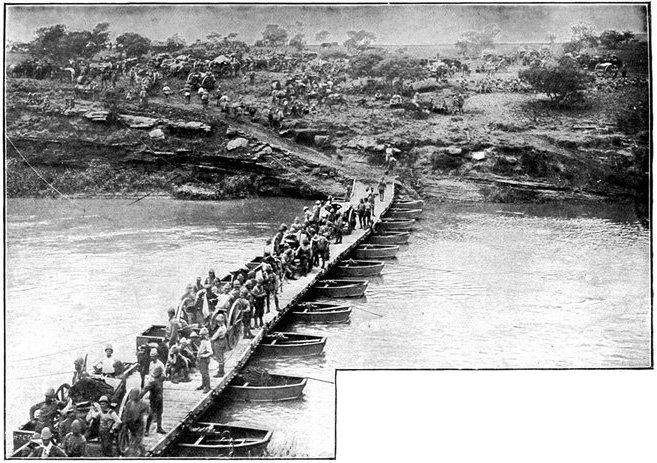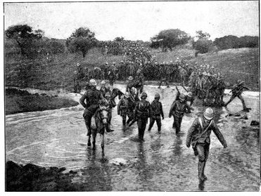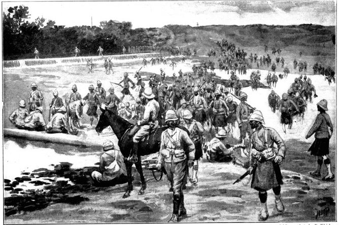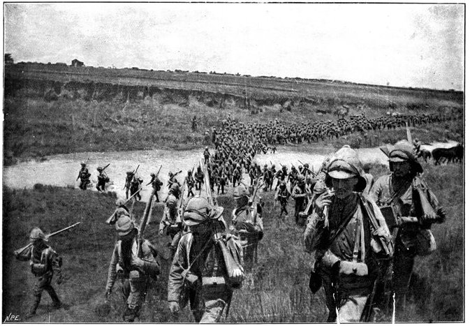 Early in the morning of the 13th Lord Roberts arrived to see the cavalry march off. Delay had been necessary to obtain supplies and to feed the horses, as their forage did not come in till it was broad daylight. The Field-Marshal warmly praised General French and his men for the skill and success of their movement. It was a most auspicious opening to a splendid campaign, and filled all with renewed confidence. The infantry, too, had indeed deserved well. The marching of the Sixth and Seventh Divisions through the heat had[Pg 351] been superb, for though the distance was not great, the tracks were sandy and exceedingly bad, and the dust suffocating. In the best of spirits, about 11·30 a.m., the Cavalry Division moved off, with orders to cover a distance of twenty-five miles and seize by nightfall the important fords over the Modder River known as Klip Drift and Rondeval Drift. The lateness of the start, though unavoidable, added greatly to the difficulty of the task. The sun was already high and the heat great as the horsemen went forward over the plain in magnificent array. Behind them the advance brigade of the Sixth Division was already marching out, to follow in their wake to Wegdraai, a farm with good water, half way between the Riet and Modder. Behind this brigade again, the rest of the Sixth Division and the whole of the Seventh Division were nearing Waterval Drift, and the Ninth Division was on its way to Ramdam.