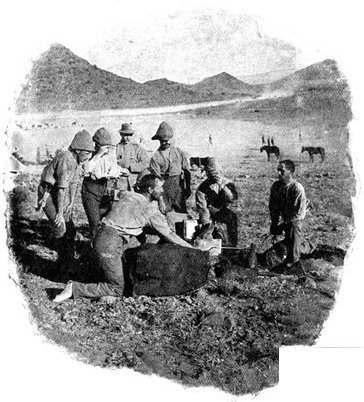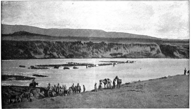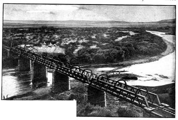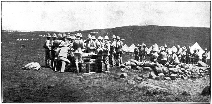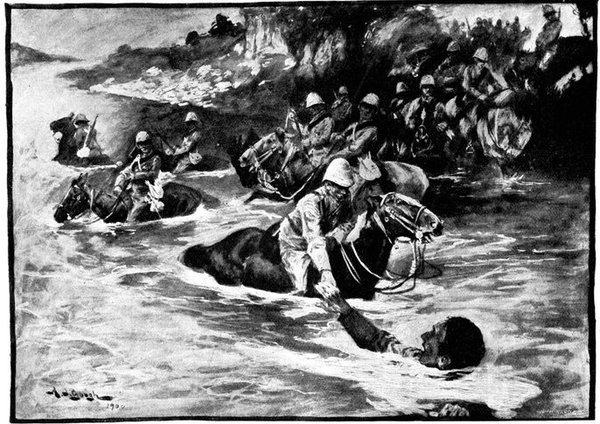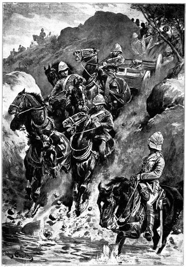 For the moment the Horse Artillery were ordered to silence the Boer gun—a task which it achieved with the greatest expedition. Then the general boldly determined to try a new kind of strategy, which was nothing more nor less than to walk his men round the Boers, and leave them disconsolately holding their kopje against no one, and reflecting sadly upon the fact that at last the "rooineks" could move as fast as or faster than themselves. But not wishing as yet to disclose his real intentions, he directed General Gordon with one brigade to go through all the elaborate ritual of an attack, shelling the kopjes and holding the enemy's attention. While this display was in progress, General French with his two other brigades, turned, leaving Waterval Drift on his left, and rode rapidly east, cutting loose from all his communications, towards De Kiel's Drift, five miles higher up the Riet. Here signs of the enemy's presence were again unmistakably felt, but the river was reached and forded just in the very nick of time. In fact, the Boers rode up only five minutes after the passage had been secured. On the south side were two high kopjes, which appeared as if they had been simply designed for Boer warfare, and which in the hands of the enemy might have caused no small amount of trouble and loss. These General French seized and occupied with dismounted men without a moment's delay. As word was passed back along the[Pg 350] line that the river had been gained, the men pressed forward with inconceivable eagerness to the streak of green foliage which told at last there was water to drink, and that the object of the day's march had been won. The drift was a very difficult one, the road winding round between the kopjes and dropping sharply to the stream. Still higher up, Roberts' Horse crossed under fire, and in so doing lost four killed or wounded. The Boers, when they saw that De Kiel's Drift was lost and that the British cavalry were upon their line of communication, fled in the utmost confusion, yet managed to remove the two guns which they had with them. Could only the Horse Artillery have come rapidly into action after crossing the drift, they might have been severely punished. But the day had been suffocatingly hot, and the men and horses were so ungovernably eager to drink, that delay was inevitable. As the sun went down General French established his headquarters at a farm near the ford, whence he found that the inmates had fled in such haste that they had left behind them hot coffee, upon which the general and the staff rioted.