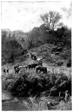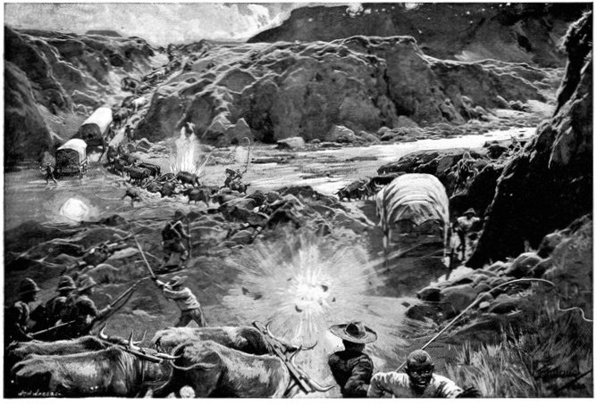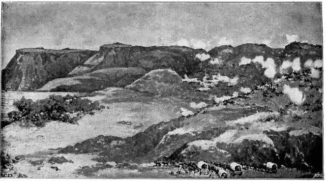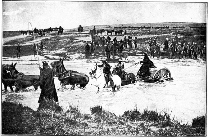 THE LOSS OF THE CONVOY AT WATERVAL DRIFT.In the rear of the grand army marched a convoy of over 200 waggons, laden with immense quantities of stores, forage and provisions for the army, and drawn by over 3,000 head of oxen—a month's supplies for a force of 40,000 men. They were in charge of a quite small escort, composed of a company of Gordons and eighty mounted infantry. The convoy had moved slowly behind the army, where, it was thought, no danger was to be feared, from Ramdam to Waterval Drift. At Waterval Drift it began its crossing of the river under cover of the Ninth Division, some 10,000 men strong. But the drift was of such an execrable nature that its passage by the enormous train of waggons was a matter of many hours, and at this moment, when troops might be wanted, and badly wanted, on the banks of the Modder, time could ill be spared. The banks of the Riet at Waterval, as is common with South African streams, were steep; at the bottom lay the river bed, 100 yards wide, with only a trickle of water in the centre and everywhere else soft sand three feet deep, in which the waggons sank up to their axles, inflicting the most prodigious labour upon the teams of oxen and mules that dragged them. Three teams had regularly to be employed to drag each laden vehicle up the northern bank, which meant that two waggons had to stand still for each one that moved. And thus it came to pass that after hours of waiting, the Ninth Division marched off before the crossing was nearly completed. The convoy was left to its diminutive escort. "There are no Boers in the country," said everyone.[Pg 361] Yet at this very moment De Wet with a party of about 1,000 men, summoned from Colesberg to Cronje's help, was riding up the Riet from the squalid hamlet of Koffyfontein. A great way off he saw the dust and heard the tumult of shouts and cracking whips that proceeded from the convoy, and, after reconnoitring and discovering that there was no British force near capable of resistance, opened a tremendous fire, just after 9 a.m.