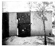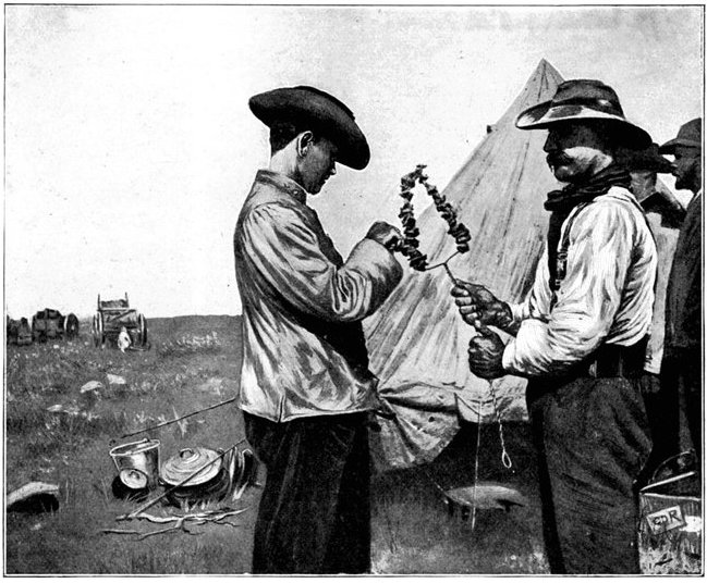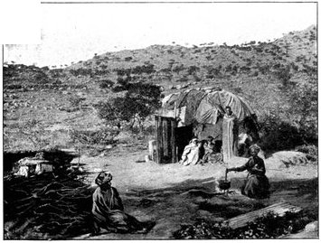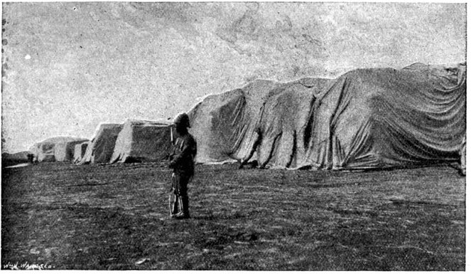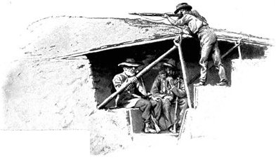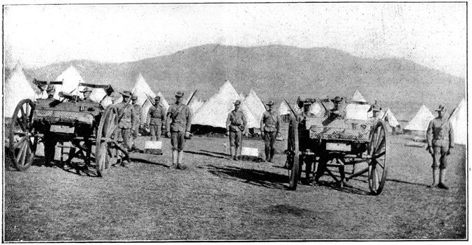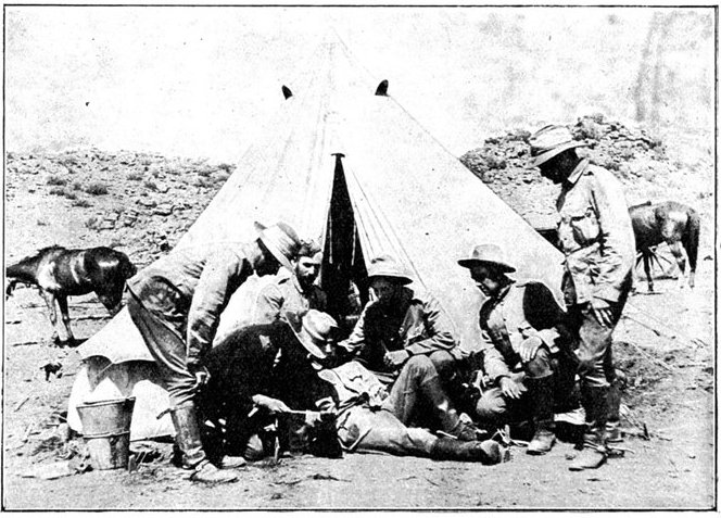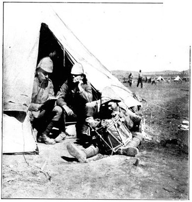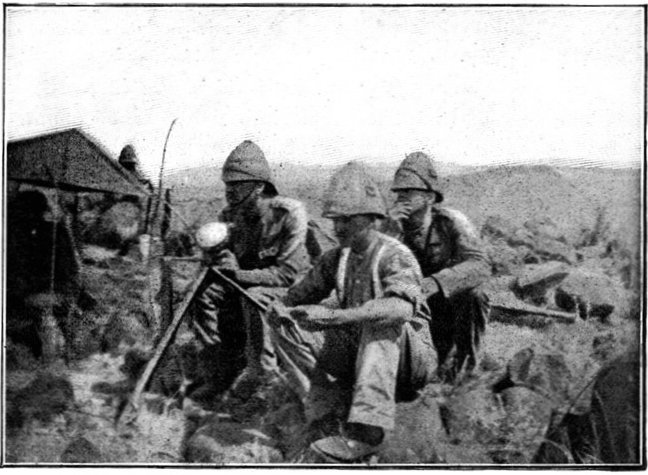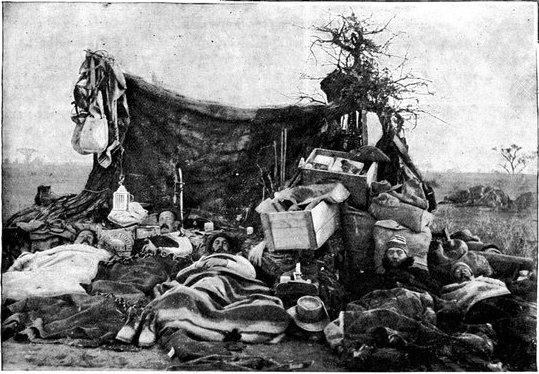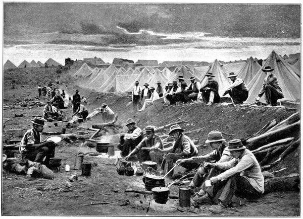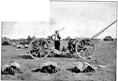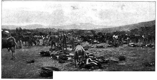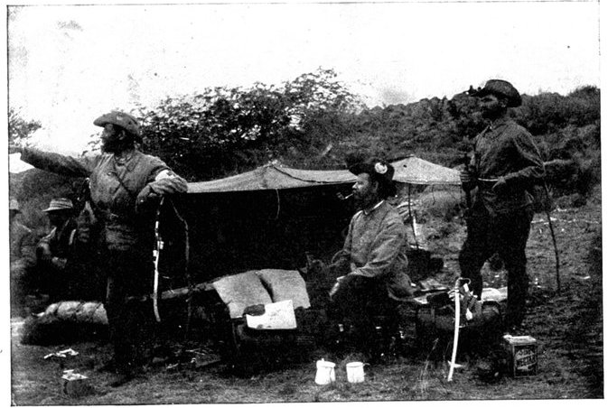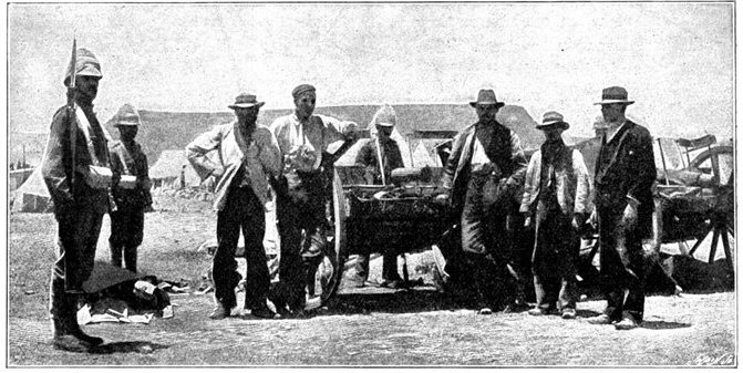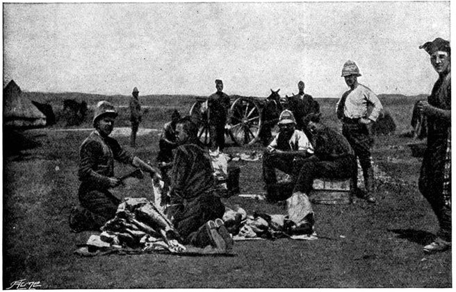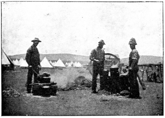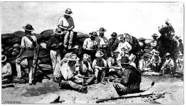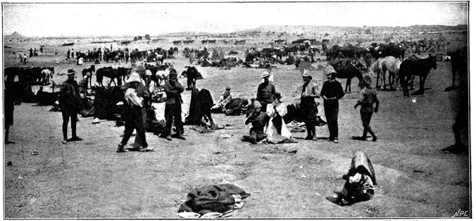 GENERAL FRENCH'S TROOPS BIVOUACKING IN THE BOER LAAGER OUTSIDE KIMBERLEY.The state of the Boer trenches gave clear evidence of the haste with which the enemy had retreated. Mr. Ralph, who examined them, gives this interesting description:—"The Boers had gone away in such a hurry that they had no time to take their belongings with them. Evidently the order was 'every man for himself, and no time must be lost.' Consequently the position was littered with trunks, saddles, tin boxes, bags of mealies, of mealie flour, and of rice. Cartridges were as thickly strewn about as if they were as cheap as dead leaves in autumn. Blankets and clothing were also much in evidence. In places the frightened Boers had made an effort to hide their leavings by piling them in the trenches, and then throwing skins or canvas over them, and dirt and tree branches on top of all. In their trunks we found usually only clothing and letters. Much that they had been using was of British make, largely taken from the British dead. Dozens and dozens of bullock hides were in use there, for shelters and for coverings. These had been taken fresh from the backs of the cattle, and the sun was making them fizzle and bubble, frying the fat and tissue on the underside of each, so that they exhaled a nauseating stench. But this formed the least part of the effluvia. A plague of flies helped to make the pest spot still more unendurable. From every shelter, and pole, and bush hung strips of biltong (jerked beef or venison), for they had not dared to stop even long enough to take away this main staff of their lives."