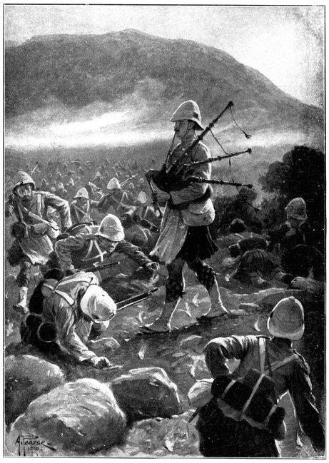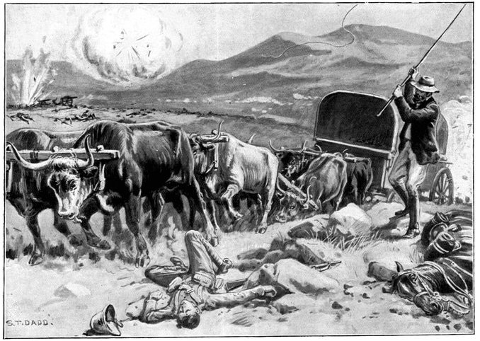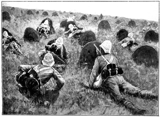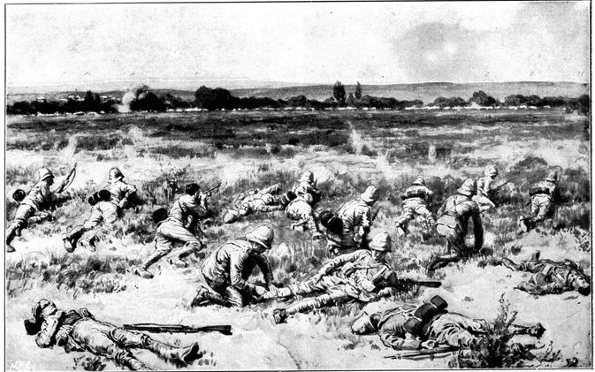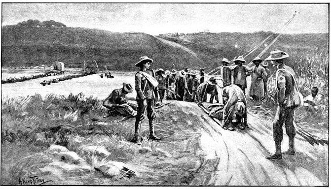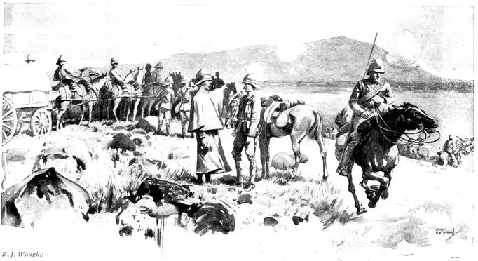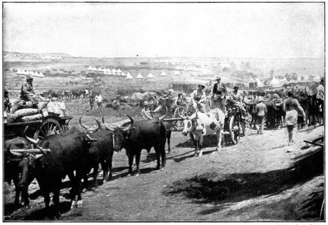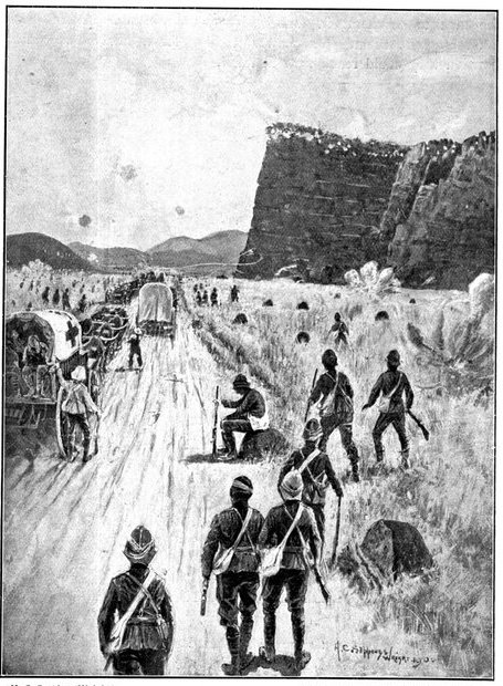 The Gordons at once extended and replied, while the officer in charge of the convoy telegraphed to Lord Roberts detailing his position and asking for reinforcements. Some squadrons of Kitchener's Horse, the 1st Scottish Borderers, and a battery of the Seventh Division were promised, and, though well on the way to Wegdraai, received orders to march back with all speed. But already the Boers had brought up guns, and were playing upon the convoy with deadly effect. The oxen were falling fast, though the men did not suffer so much, being under cover. But when at last the boom of the British field battery to the north told that relief had arrived, the Boers ceased their bombardment, and could be seen falling back. Kitchener's Horse now came up, and attempted, but without complete success, to turn the Boer flank. The convoy had been saved—for a time. All that were left of the oxen were at once sent down to the river to be watered, a difficult process with so many beasts when the drivers could not be found. But as they came up again from the river a fresh mishap occurred. The Boers again opened fire, killed or drove away the men in charge, and the animals forthwith went grazing along the river banks, direct towards the enemy. Attempts were made unsuccessfully to head them off, but only a few could be saved. Of the 200 waggons, 176 were left helpless for want of cattle.