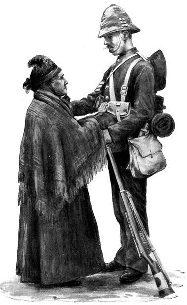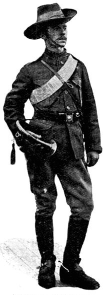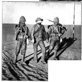 Khaki, originally used in India only, but now universal in foreign campaigns, is a canvas-like fabric, cool in summer and warm in winter. It is precisely the colour of the dusty, yellow-brown veldt, and its name is derived from the Persian word for dust.