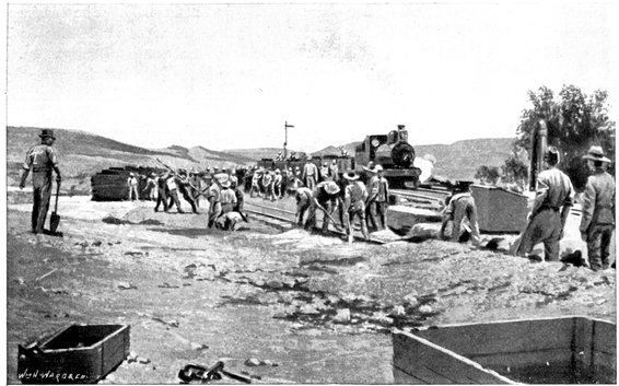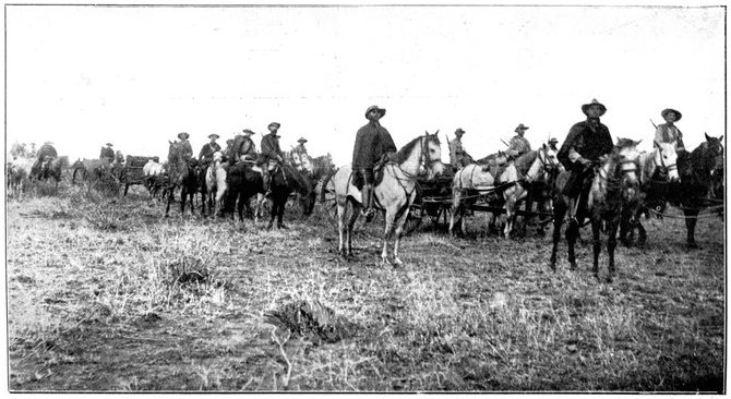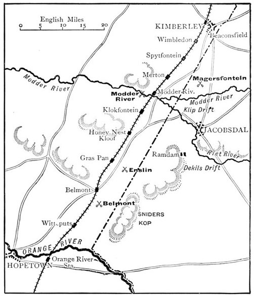 All down the line men were in movement. From Orange River Camp, on the morning of the 10th a great convoy, hundreds of waggons strong, was advancing on Ramdam, an important road-junction, in charge of a strong force of mounted infantry under Colonel Hannay, whose task it was to clear of the enemy the country to the south of the Riet. All the 11th he was in contact with a party of 300 or 400 Boers, detached from Cronje's force, who hung upon his flanks and rear, skirmishing continually, but none the less he held steadily on his way to Ramdam.