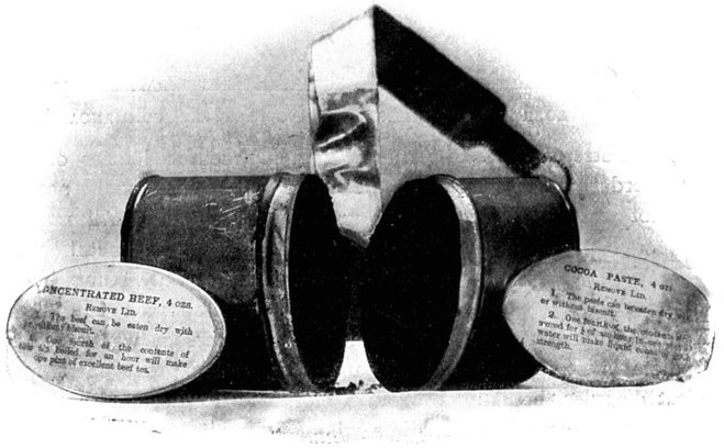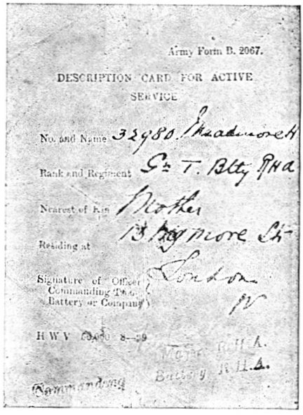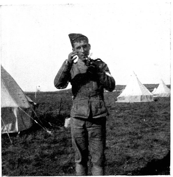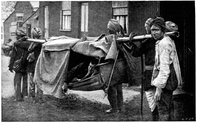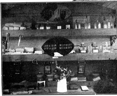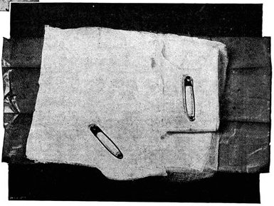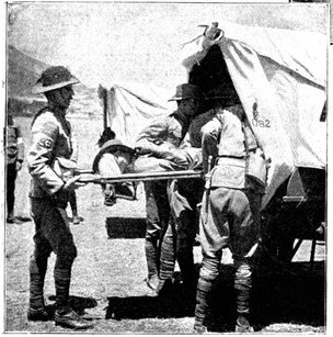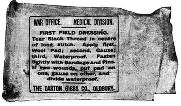 The dressing, which consists of a sheet of waterproof, gauze, cotton wool, bandaging, and two safety pins, packed first in an extra sheet of waterproof and then in a bag of lining material, is sewn into one of the bottom corners of the jacket of every man who goes on active service, the description card occupying the corresponding corner on the opposite side.