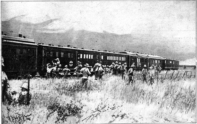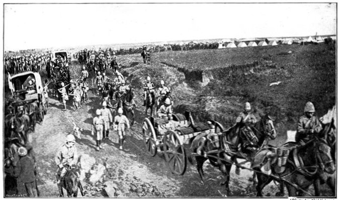 As the night of the 10th fell, there was an unwonted bustle in Modder River Camp. Train after train laden with troops went rattling southward through the darkness, carrying battalions and batteries to the points of concentration down the line. The whole cavalry division was under orders to start at 3 a.m. Lord Roberts, in his plain khaki uniform, with no sign of his countless orders and decorations, had, earlier in the evening, ridden round the various camps. He now convened the commanding officers of the cavalry division and made them one of his brief speeches. They were about, he said, to start upon an expedition which he knew they would welcome as an opportunity of maintaining the traditions of British cavalry. They formed the largest British cavalry division that had ever worked together as a whole. The object of their operations was the relief of Kimberley. Things were so desperate that a dash must be made, and he would follow as best he could with the rest of the army. Lord Kitchener had put the need for sacrifice even more strongly. The cavalry, he had said, were to reach Kimberley even if they left half their strength upon the road.