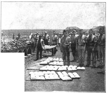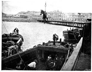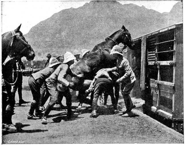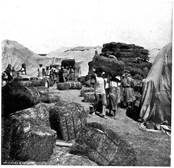 HANDLING FODDER AT ORANGE RIVER CAMP.The necessity for bringing up fodder for the horses from the immense stores accumulated at Orange River Camp occasioned some delay in the advance on Kimberley.