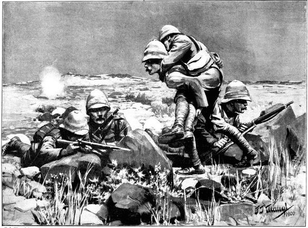 It is easy to ascribe our defeats in the early part of the war, as some have ascribed them, to the "stupidity" of the British officers and generals. At bottom, however, it would seem that much of this unsuccess was due to the new conditions of war, coupled with the Boer's inherited capacity for taking cover and his absolute knowledge of the country. Again and again our men came suddenly and almost without notice under a deluge of bullets from perfectly invisible rifles. When once engaged in this manner it was difficult for them to go forward and dangerous to retreat. There was no means of guessing the strength of the foe. No dense clouds of smoke revealed at once his location and the exact volume of his fire. It was uncertain whether we had to deal with 500 men using magazine fire, or with 5,000 firing in a leisurely manner. There may have been a neglect of reconnaissance, yet against troops thus concealed personal reconnaissance repeatedly failed. On their side the Boers had no such difficulty to face in fighting us. All through our earlier battles we disdained the use of cover and often advanced to the attack in comparatively close formations—a splendid target.