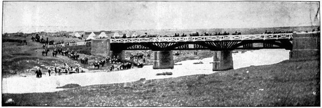And now, about 5·30 p.m., the goal of the day's march came into view. To the north could be seen a line of dreary green—the bushes which fringe all South African rivers. General French went forward to reconnoitre, halting his division and changing its formation. Gordon's Brigade was deployed on the left, Broadwood's on the right, and Alexander's ordered to follow as a rearguard. It had already dropped much behind and had lost no less than sixty of its horses. A few minutes' examination and reflection convinced General French that the wisest course was to push on rapidly for the drift, even though there were clear traces of the enemy, and though a Boer laager could be seen by the stream. Gordon on the left was to seize Rondeval Drift, Broadwood to take Klip Drift. Each Brigadier unlimbered his horse guns and shelled the enemy before crossing. But there was no real resistance; the Boers, aghast at the rapidity and resolution of General French's movements and staggered by the shrapnel from the Horse Artillery 12-pounders, fled in utter confusion, abandoning three laagers, 150 waggons, much ammunition, and a quantity of cattle and sheep. "Some of the larger cases in the Boer camp, marked 'biscuits,' of which there was a regular stack, were found to contain rifle ammunition," says a correspondent with the division. "The marks on the cases showed that they came from Europe viâ Delagoa Bay." The telegraph line from Magersfontein to Bloemfontein was broken, and Cronje left without other means of communication than those the heliograph afforded. Thus the Modder Drifts were won, and now the way to Kimberley was all but open. The seizure of the drifts was, in the judgment of a competent officer, the crisis of the whole elaborate series of movements which ended a fortnight later in the glorious success of Paardeberg. For if General French had waited or hesitated, the Boers would have called up reinforcements and a desperate fight would have been necessary before the river could have been crossed. And in the delay which must thus have been caused, Cronje might well have escaped. General French had risked much, since, so far as he knew, the Boers had 6,000 to 7,000 men along the Modder line and at Magersfontein, while no support could reach him until, at the earliest, the evening of the 14th. His total losses did not exceed half-a-dozen officers and men, and about 100 horses.