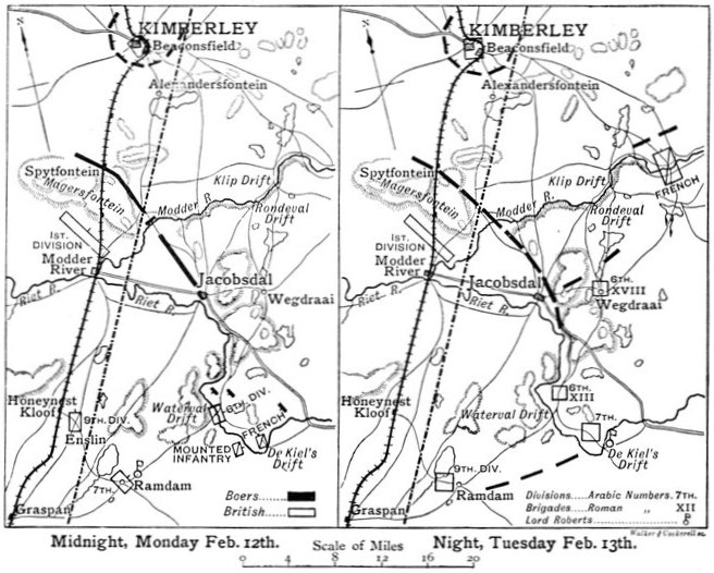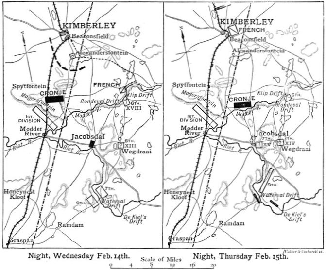 All through the 15th the Sixth Division had been engaged in skirmishing with the Boer force through which General French had cut his way. This force hung about the drift, and exchanged fire at long range, but though its "sniping" caused some annoyance, it was too weak to effect anything serious against a whole infantry division, with three batteries of artillery. At Magersfontein, Cronje had now at last arrived at the decision to retreat. Already burghers were riding off right and left, in a wild helter-skelter, heedless of commands and orders. What little discipline existed in the Boer camp had been greatly weakened by the presence of the enemy in the rear. About noon, at the instance of the Field Cornets, a council of war was summoned. High words were exchanged between Cronje and the European adventurers, who pointed out the peril of each instant's delay. But the final vote was for retirement, mainly through the insistence of the Free Staters, who were full of fear for their cattle and their farms. All outposts were withdrawn, and with the utmost precipitancy the burghers were called in from the trenches. The Boers abandoned everything except the essentials—food, ammunition, and the waggon train—and received orders to march with dawn along the Modder River, in the direction of Bloemfontein. What had led Cronje to this determination was the sight of General French's division scudding across the plain to Kimberley, and the columns of dust that rose in all directions on his left, betokening Lord Roberts' march. But his rooted opinion that the British could never move a large force away from the railway, his persistence in the belief that the object of all the British manœuvres was another assault on Magersfontein—this time from the direction of Jacobsdal—and his failure to seize the true purpose of the British Commander-in-Chief, had already undone him. In spite of frantic efforts it was now all but impossible for him to escape from the net which Lord Roberts had so skilfully spread. Nor was his force anything like so strong as the British officers opposed to him had believed. Instead of eight or ten thousand it had melted in the last few hours till it probably did not exceed at this juncture 5,000 men. About these were fully 26,000 British infantry and over 7,000 mounted men. The odds were such as to render the struggle all but hopeless.
