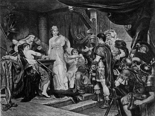 Of the sacrificing and prophesying priestesses of the Cimbri, the first Teutons who knocked powerfully at the gates of Italy, we shall speak later. When, in B. C. 58, Cæsar offered battle daily to Ariovistus, the Suevian king who had broken into Gaul and installed himself there, the latter, though a fierce and heroic warrior, did not accept it. Cæsar learned from Teutonic prisoners that the prophetesses, in consequence of lots and divinations, forbade the king, if he hoped for victory, to engage in battle with the Romans before the new moon. The battle was, however, forced by Cæsar and it ended with the total rout of the Teutons. Cæsar's envoy, Procillus, who had been held in chains by Ariovistus according to the barbarian fashion, escaped from his captors and related to Cæsar his terrible experiences in the camp of the king. It had been a vital question whether Procillus should be burned at the stake or kept for a future occasion, and this was thrice determined in his favor by the lots cast in his presence by the wise women. Here, as elsewhere, women interpreted the decree of fate. Tacitus mentions Albruna (called Aliruna by Grimm) as an ancient prophetess venerated by the Germans during the expeditions of Drusus and Tiberius in the interior of Germania.