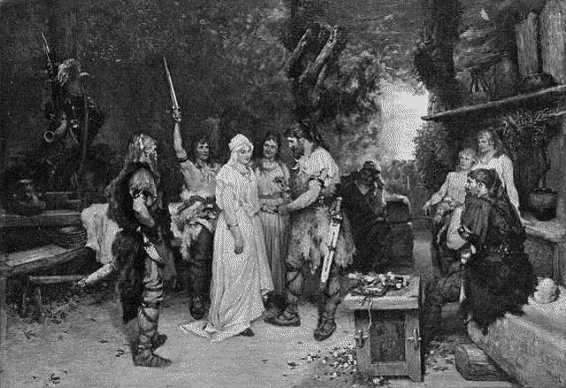 It is certain that the prehistoric Germanic community began with the communal use of women for pleasure or profit. This common use could be broken and suppressed only by marriage by capture. If the man wished to have exclusive possession of a wife, he had to procure her from outside his own community. Besides this exogamic marriage, an endogamic marriage was later recognized as conferring title, on the condition that the man reconciled the woman's blood relatives by the payment of a definite compensation. This system of marriage by capture survived the Migration period, and was found in Sweden even in the early Middle Ages.