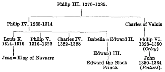 By this tortuous combination Edward III. advanced his claim. His mother had been the grand-daughter of Philip III. of France, and he was a male. Her father was the elder brother of Philip of Valois’ father, so he claimed before Philip of Valois.