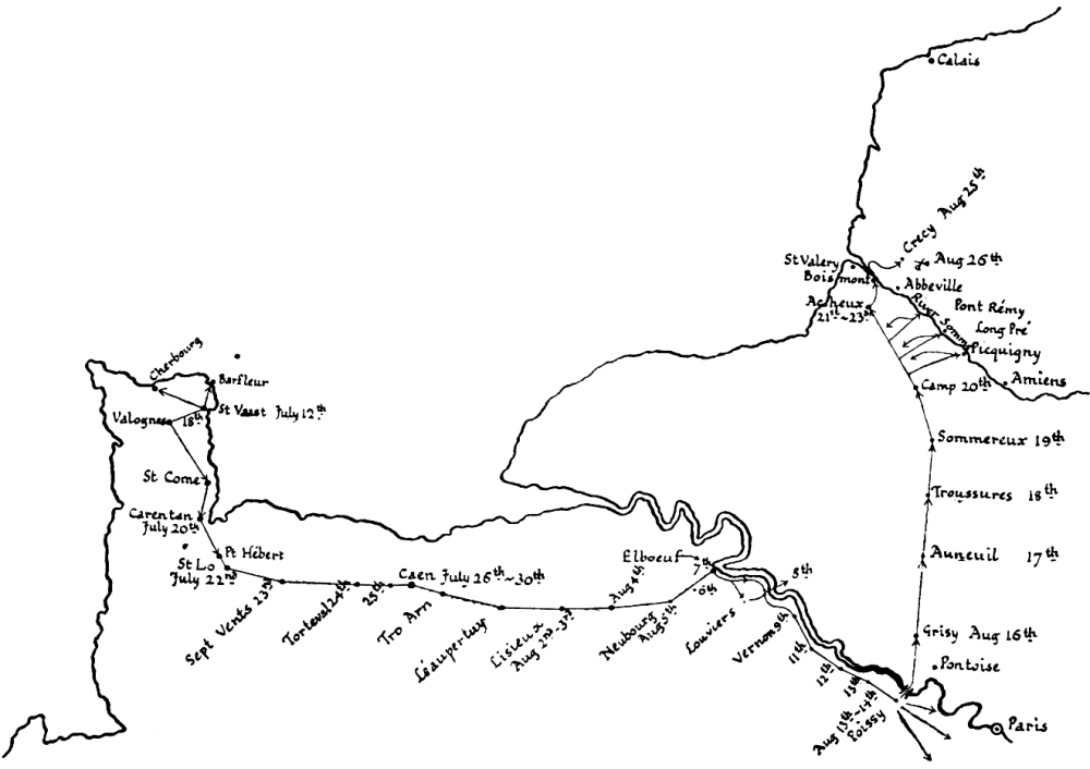 On that Tuesday it struck inland for Valognes, a march of 10½ miles. No proper coast-road existed even as late as the eighteenth century, let alone in the Middle Ages, and an army making for Paris or for the crossing of the Seine could not choose but to go thus slightly out of its way.