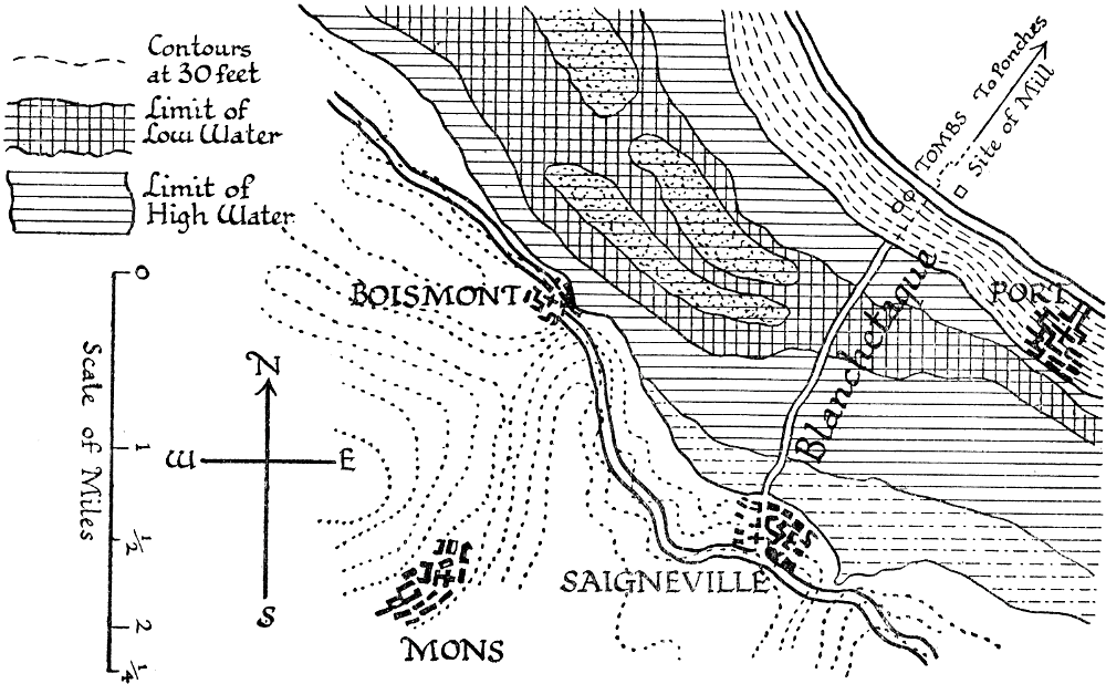 But there is more. The forming of successive embankments one below the other for the gradual reclamation of land in the Somme estuary was not an easy matter. They had to be strong to withstand a strong tide, and there was no good bottom to be found in the deep mud of the valley floor. It is a significant evidence of this difficulty that the embankments stand so far apart, and that the last has had to take advantage of the long-established work of the railway viaduct. It is therefore a legitimate conjecture that the hard bottom afforded by the old Blanchetaque would be made use of, and as a fact we find the principal embankment between Port and the sea coinciding exactly with the line established by the tombs, the parish boundaries, and the site of the mill.