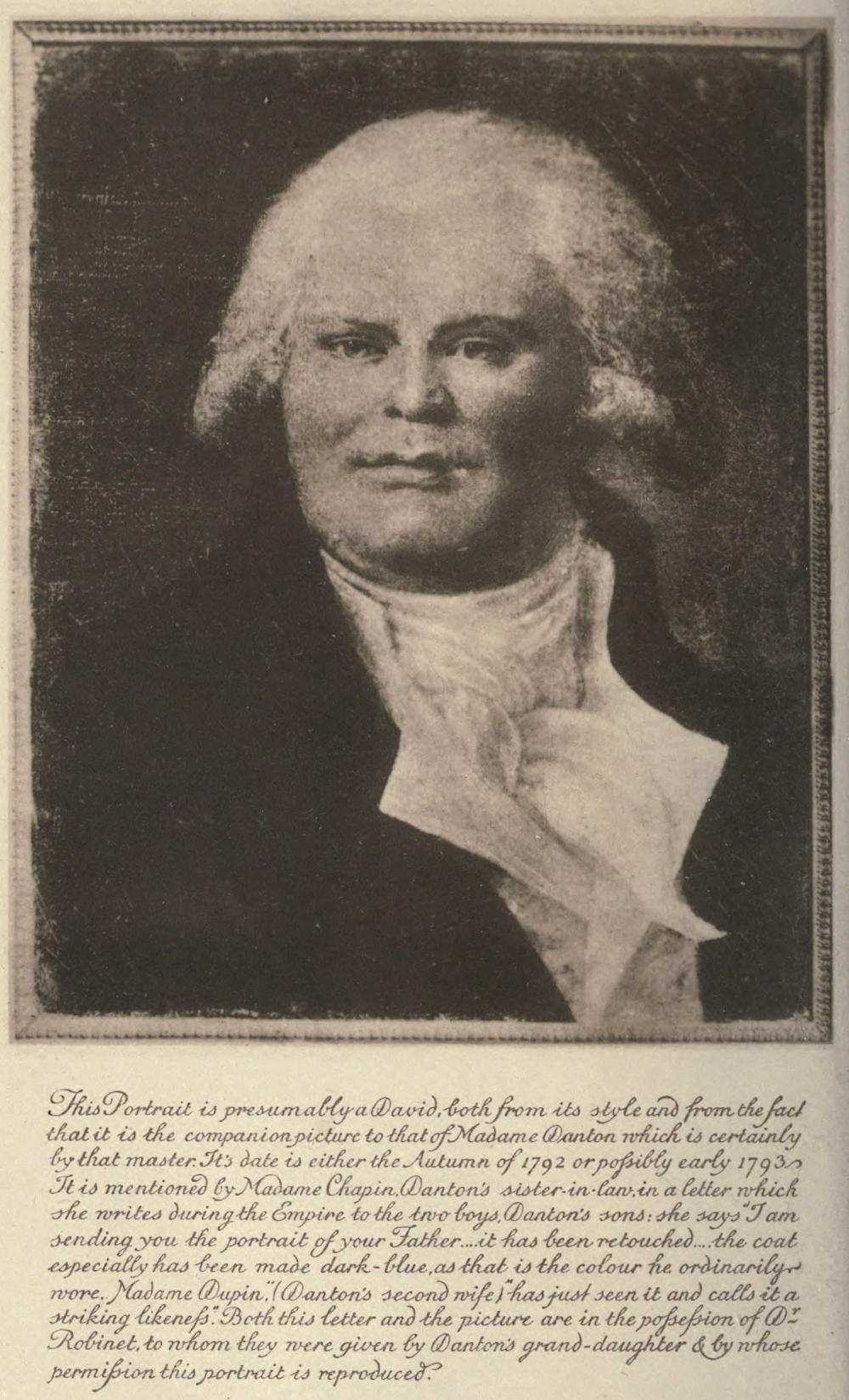 This Portrait is presumably a David, both from its style and from the fact that it is the companion picture to that of Madame Danton which is certainly by that master. Its date is either the Autumn of 1792 or possibly early 1793. It is mentioned by Madame Chapin, Danton’s sister-in-law, in a letter which she writes during the Empire to the two boys, Danton’s sons: she says “I am sending you the portrait of your Father ... it has been retouched ... the coat especially has been made dark-blue, as that is the colour he ordinarily wore. Madame Dupin,” (Danton’s second wife) “has just seen it and calls it a striking likeness.” Both this letter and the picture are in the possession of Dʳ Robinet, to whom they were given by Danton’s grand-daughter & by whose permission this portrait is reproduced.
