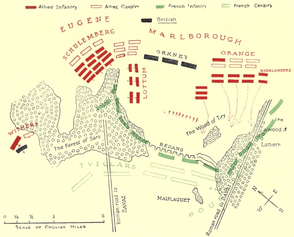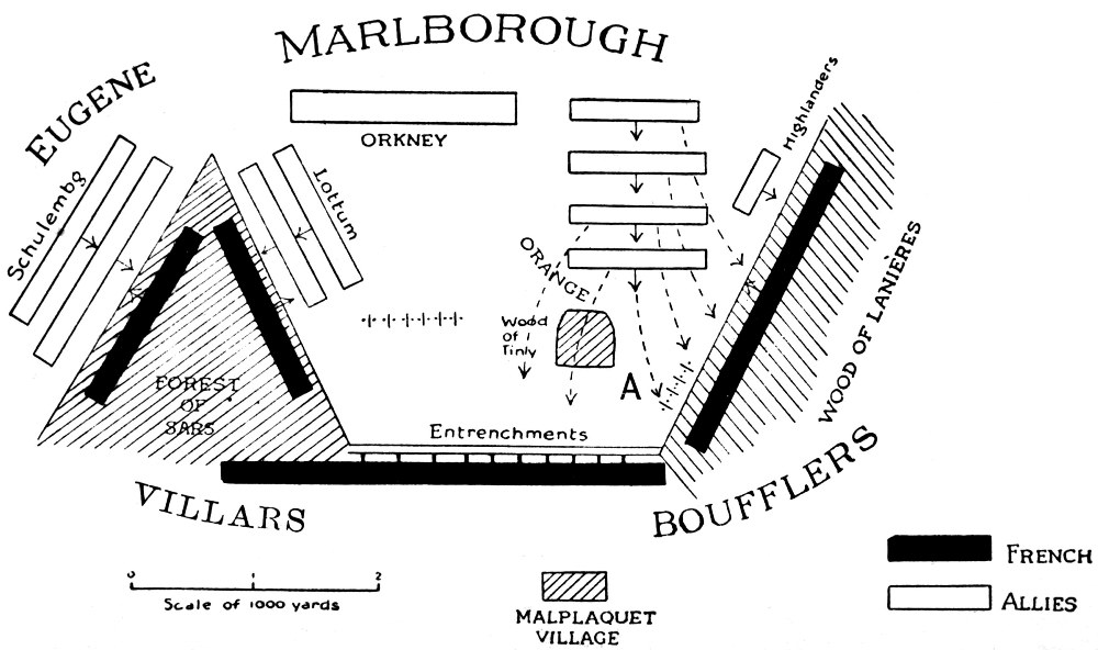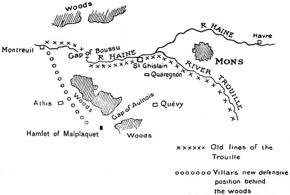 [7] Technically the line of defence was forced, for the line of Trouille was but a continuation of the lines of La Bassée—Douai—Valenciennes. So far as strategical results were concerned, the withdrawal of Villars behind the forest barrier was equivalent to the reconstruction of new lines, and in the event the action of Malplaquet proved that new defensive position to be strong enough to prevent the invasion of France. On the other hand, there is little doubt that if Villars had been in a little more strength he would have elected to fight on the old lines and not behind the woods.