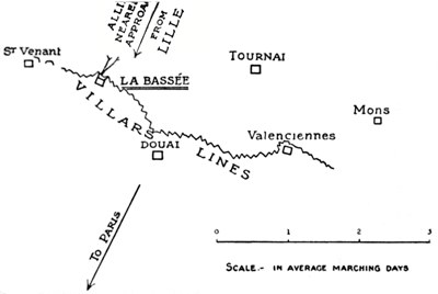 It was upon the 3rd of June that Louis XIV. had written to Villars telling him that a renewal of the war would now be undertaken. On the 14th, Villars began to throw up earth for the formation of an entrenched camp between the marshy ground of Hulluch and that of Cuinchy. Here he proposed to[Pg 30] concentrate the mass of his forces, with La Bassée just before him, the town of Lens behind. He used the waterways and the swamped ground in front and to the right for the formation of his defensive lines. These followed the upper valley of the Deule, the line of its canal, and finally reposed their right upon the river Scarpe. Though the regularly fortified line went no further than the camp near La Bassée, he also threw up a couple of entrenchments in front of Bethune and St Venant in order to cover any march he might have to make towards his left should the enemy attempt to turn him in that direction.
