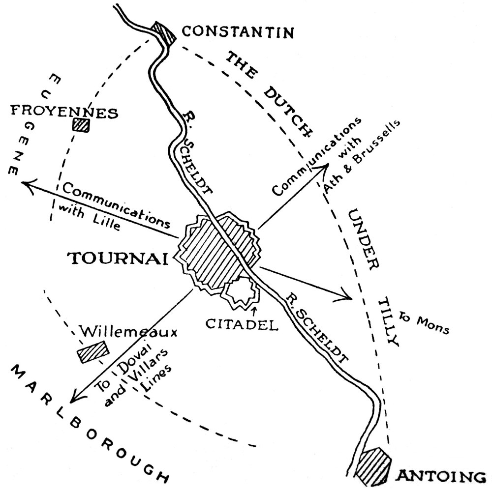 The 27th was passed without a movement, Villars refusing to leave his entrenchments, and the commanders of the allies giving no hint of their next intention. But during that same day Tilly with the Dutch had appeared before Tournai. On the evening of the day Marlborough himself was before the town. On the 28th Prince Eugene joined both the Dutch and Marlborough before the town, taking up his headquarters at Froyennes, Marlborough being at Willemeau, and the Dutch, under Tilly, already established on the east of Tournai from Antoing to Constantin, just opposite Eugene, where they threw a bridge across the Scheldt. By the evening of the 28th, therefore, Tournai was invested on every side, and the great allied armies of between 110,000 and 120,000 men had abandoned all hope of carrying Villars’ lines, and had sat down to the capture of the frontier fortress.[2]