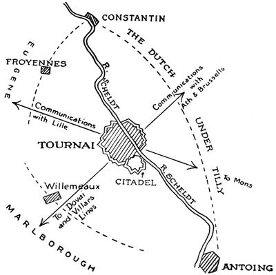 [Pg 33]A comprehension of this siege of Tournai, which so largely determined the fortunes of the campaign of Malplaquet, will be aided by the accompanying sketch map. Here it is apparent that Marlborough with his headquarters at Willemeau, Eugene with his at Froyennes, the Dutch under Tilly in a semicircle from Antoing to Constantin, completed the investment of the fortress, and that the existing bridge at Antoing which the Dutch commanded, the bridge at Constantin which they had constructed, giving access over the river to the north and to the south, made the circle complete.