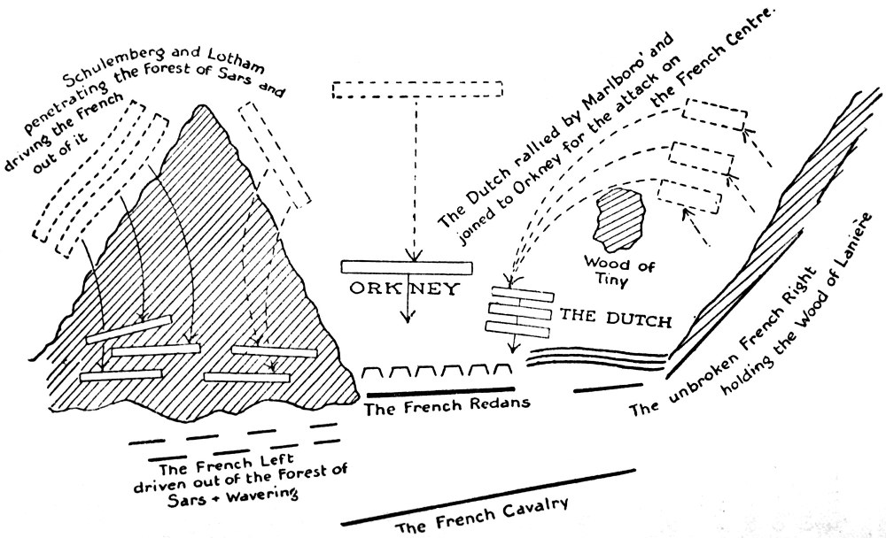 An unexpected enthusiasm lent something to the French resistance; the delay of two days lent something more to their defensive power. As will be seen in the sequel, certain errors (notably upon the left of Marlborough’s line) also contributed to the result, and the whole day was passed in a series of attacks and counter-attacks which left the French forces intact, and permitted them in the early afternoon to rely upon the exhaustion of the enemy and to leave, in order and without loss, the field to the enemy.