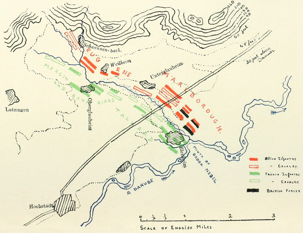 The war was conducted, as I have said, by various allies. Its success depended, therefore, upon various commanders regarded as coequal, acting as colleagues rather than as principals and subordinates. But the story of the great march to the Danube and its harvest at Blenheim, which we are about to review, sufficiently proves that the deciding genius in the whole affair was that of John Churchill, Duke of Marlborough. The plan was indeed Eugene’s; and in the battle itself he shared the glory with his English friend and colleague.[Pg 16] Again, the British troops present were few indeed compared with the total of the allied forces. At Blenheim, in particular, they amounted to less than a third of the numbers present. The excellence of their material, however, their magnificent work at the Schellenberg and on Blenheim field itself, coupled with the fact that the general to whom the final success is chiefly due was the great military genius of this country, warrants the historian in classing this battle among British actions, and in treating its story as a national affair.