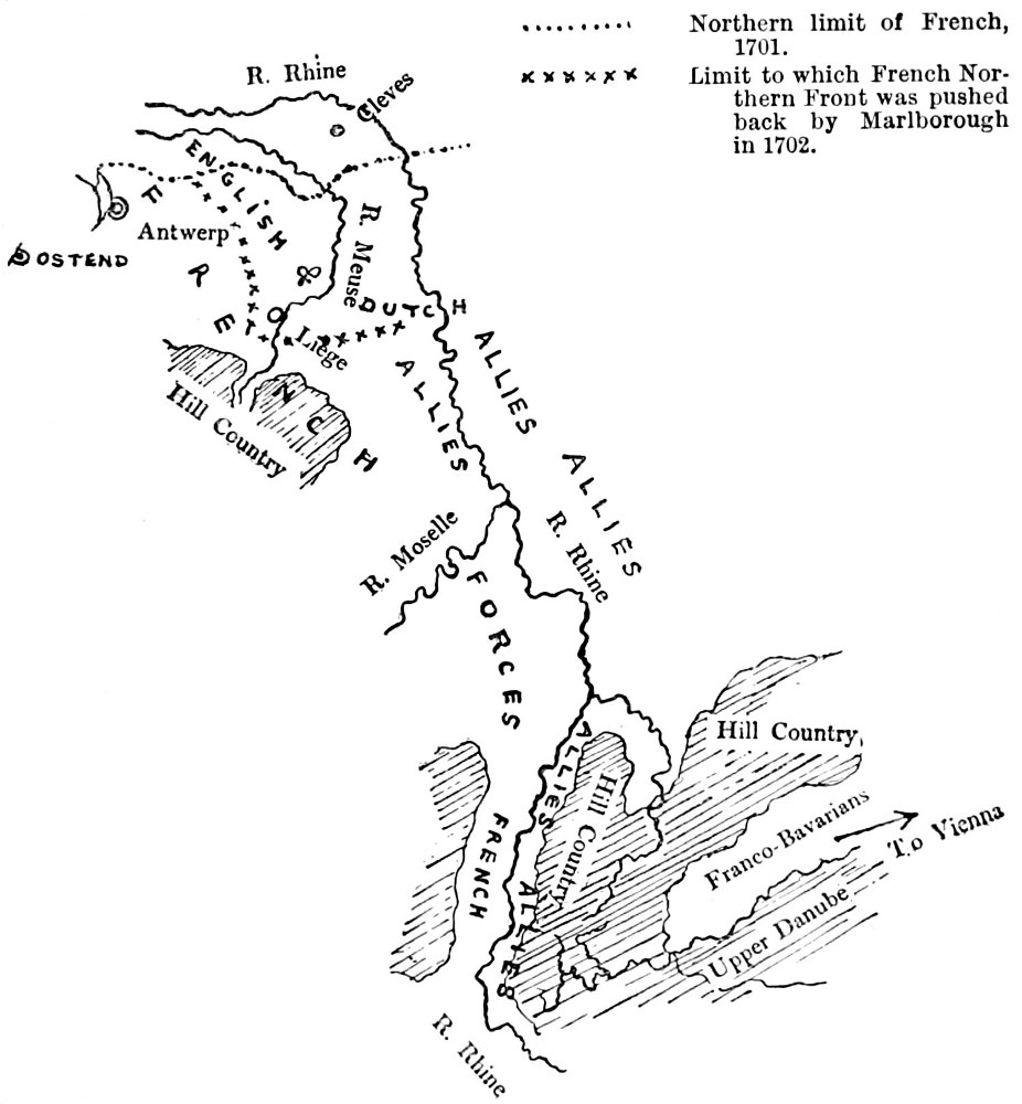 The frontier between the Spanish Netherlands and Holland—that is, between modern Belgium and Holland—was the frontier between the forces of Louis XIV. and those of opponents upon the north. Thus Antwerp and Ostend were in the hands of the Bourbon, for the Spanish Netherlands had passed into the hands of the French king’s grandson, and the French and Spanish forces were combined. Further east, towards the Upper Rhine, a French force lay in the district of Cleves, and all the fortresses on the Meuse, running in a line south of that post, with the exception of Maestricht, were in French hands.