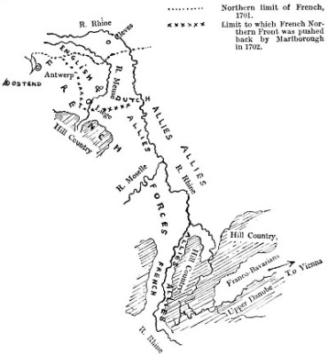 The position of the enemy at the moment when Marlborough’s march to the Danube from the Netherlands was conceived may be observed in the sketch map on page 59.