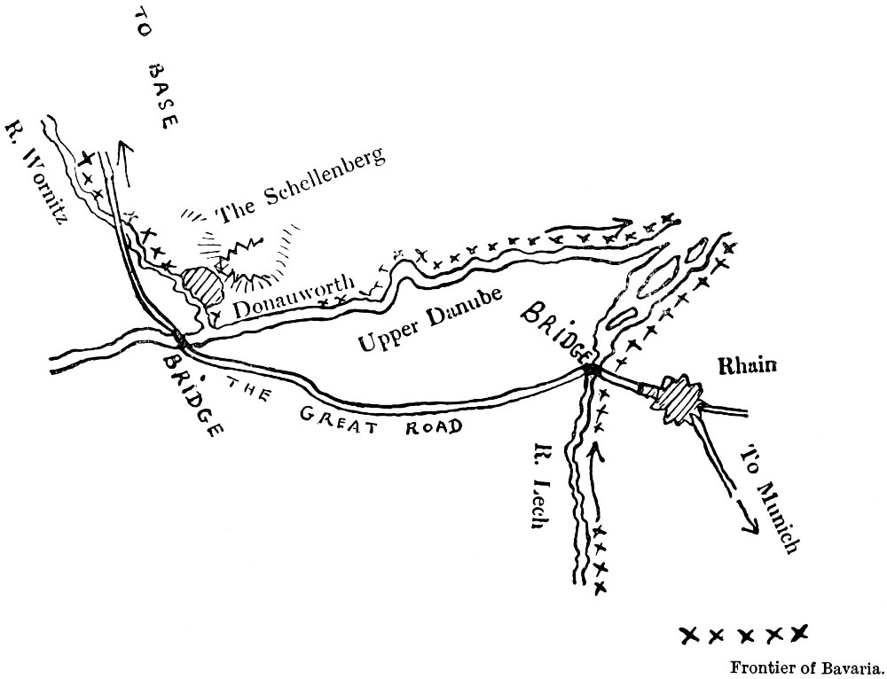 Marlborough and the Duke of Baden, with their superior forces, would have attacked Marcin and the Elector had they been their own grandsons. Napoleon, finding himself in such a situation as Marlborough’s a hundred years later, would certainly have fallen on the insufficient forces to his south, for it was known that reinforcements were coming over the Black Forest to save the Franco-Bavarian forces. To break up those forces before reinforcement should come was something which a sudden change of plan could have effected, but not even the genius of Marlborough was prepared, in his generation, for a movement necessitating so great a disturbance of calculations previously made. Donauwörth was his objective, and upon Donauwörth he marched, leaving intact this inferior hostile force which watched his advance from the south.