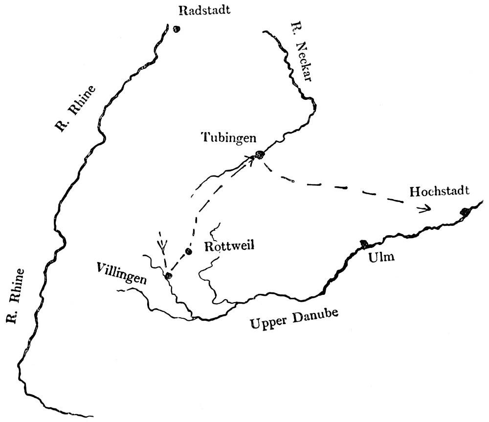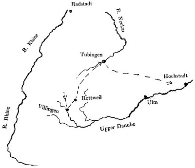 [Pg 34]Finally, the Margrave of Baden, Louis, with another separate army, was free to act at will in Upper Germany, to occupy posts in the Black Forest, or to retire eastward into the heart of Germany or towards the Danube as circumstances might dictate. This force was also small. It was supplemented by local militia raised to defend particular passes in the Black Forest, and these, again, were supported by the armed peasantry.