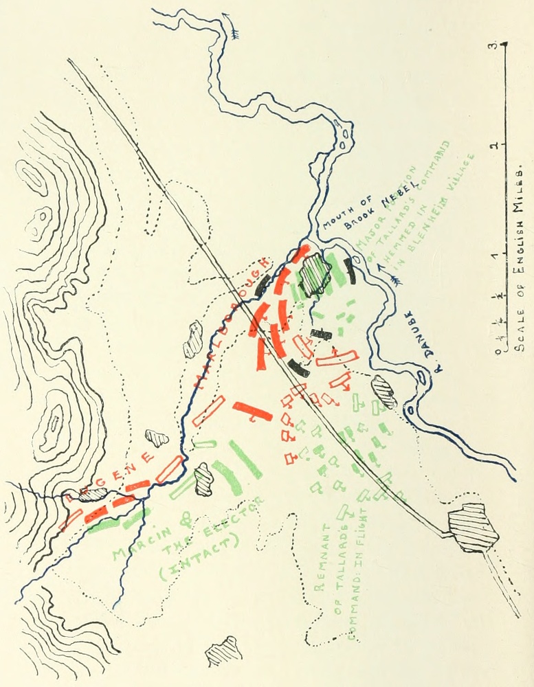[17] For some reason or other, the exaggeration of this feature—the marshiness of the banks of the Nebel—mars many an English account of the action. The Nebel, of course, was something of an obstacle, slight as it was, and in places the meadows on its bank widen out and are soft even in the dry weather which had as a whole distinguished the three weeks before Blenheim. But the crossing of that obstacle by the cavalry was nothing in the story of the battle. It was what the cavalry did after they crossed that counted.