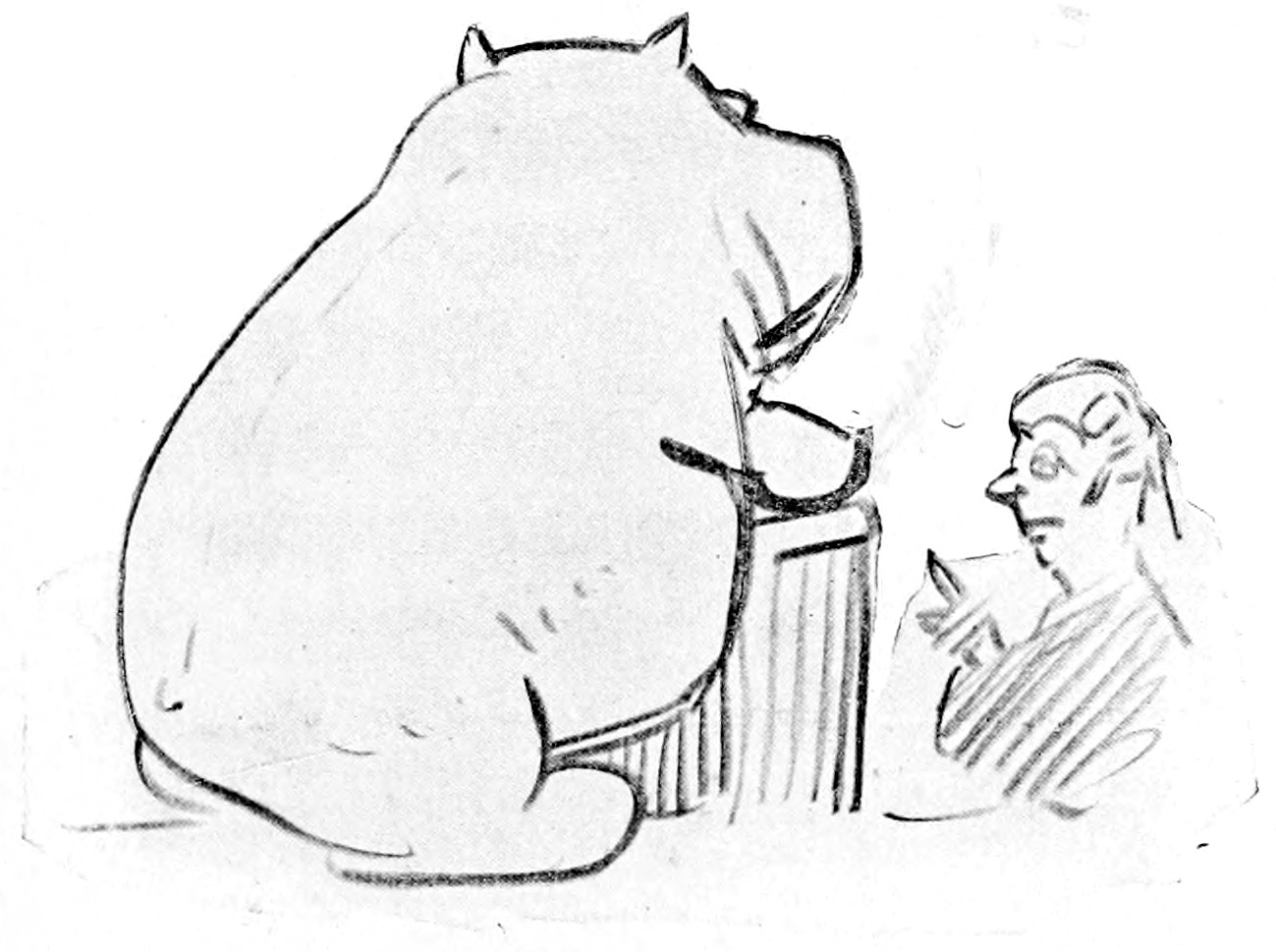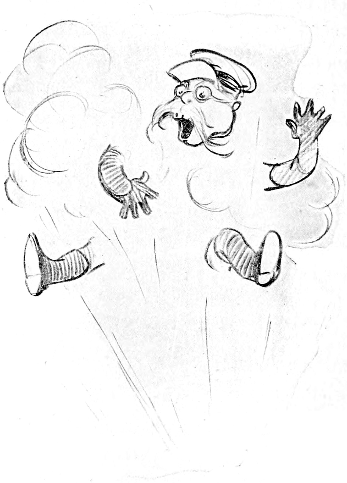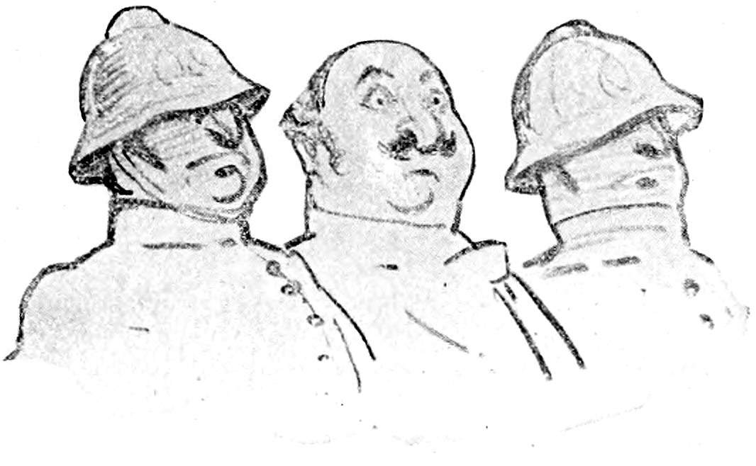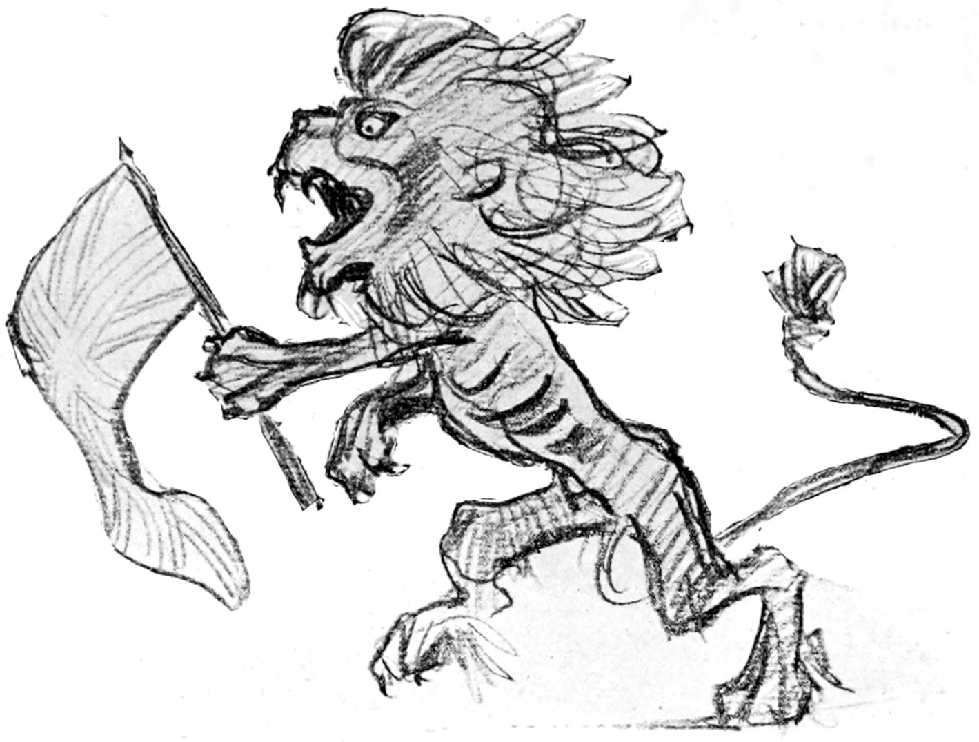 A Trained Lion was sworn, and showed, in the most amusing manner, under the artificial stimulus of a trainer with a whip, how in old age, with his teeth drawn and his spirit thoroughly broken, even so dangerous a beast could be put to the most useful work: such as rolling a log, balancing a see-saw, ploughing the sand, wiping something off a slate, doing a little spade work, and even roaring at command more loudly than in youth. The Imperial Brute was dressed in a large Union-Jack, and while it provided instruction afforded also entertainment to the company.