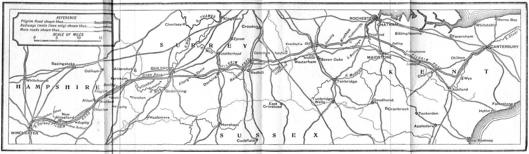 [3] The points where the pilgrims obviously left the Old Road are Compton (p. 160) and Burford Bridge (p. 181). They probably left it after Merstham (p. 205) and perhaps after Chilham (p. 271), while they certainly confused the record of the passages of the Wey (p. 165), and perhaps of the Medway (p. 242). As for their supposed excursion into the plain near Oxted (p. 213), I can find no proof of it. The places where other tracks coming in impair the Old Road are on either side of the Mole (p. 181), the Darent (p. 222), and the Medway (p. 237), where, along such river valleys, such tributaries would naturally lead.