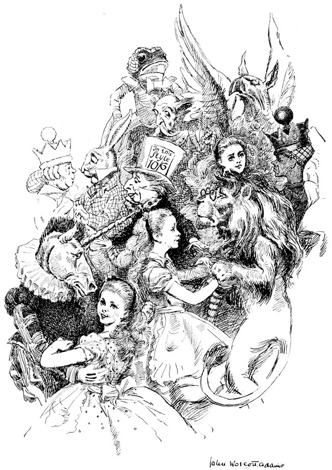 “They’ll be delighted, my dears. For they really don’t begin to live until some one finds the way to them through the gates. They are all remarkable little girls, too, in their different ways, and I know you’ll enjoy playing with them. So suppose we start. Since you can’t see me, each of you must take hold of one of my hands. Do 22you want to choose where to go first, or shall I choose for you?”