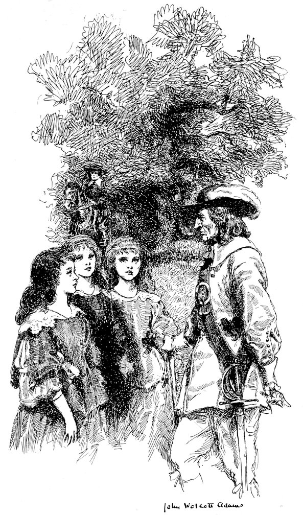 “Thank you, Mistress Wynne,” replied Darthea, smiling shyly. “Hugh and Jack and I have grown good friends at school, even though they be Quakers and I of Christ Church. May I fill these cups?” And very prettily she set about helping the others to the refreshments, while Mistress Wynne cut the cakes and served the preserves, luscious as can be imagined. Rose and Ruth and the two boys fell to in high delight, presently joined by Darthea. Then came the games, and none more joyous at these than Hugh’s sweet mother herself. They were all laughing and racing like wild things when Ruth, hiding behind a clump of Rose of Sharon, saw a group of gentlemen appearing down the street.
