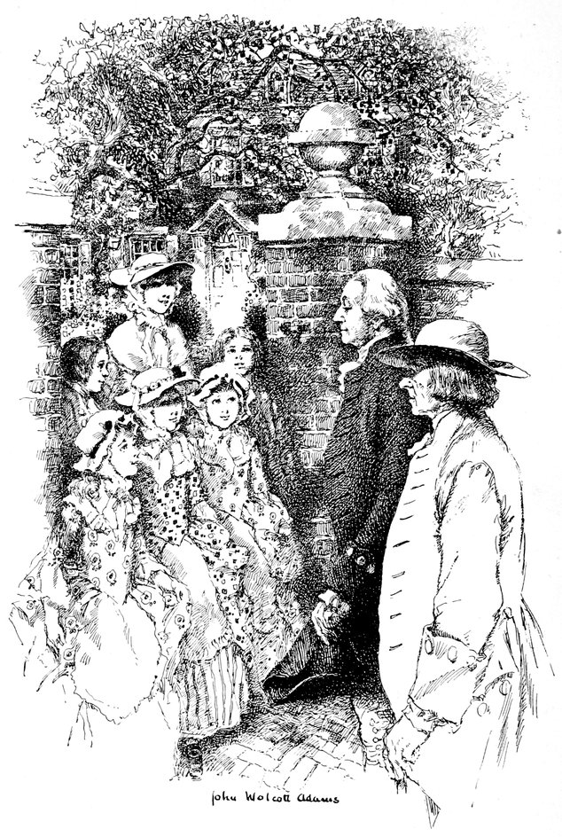 A demure little crowd they were, standing primly, hand in hand, the three maids in front and Mrs. Wynne, with the boys either side of her, looking uncommonly pretty, behind them. Rose 284and Ruth saw some four or five men, two of unusual height, one of these in Quaker clothes, the other in a blue coat and cocked hat, with his hair in a queue ... the great Washington beyond a doubt!