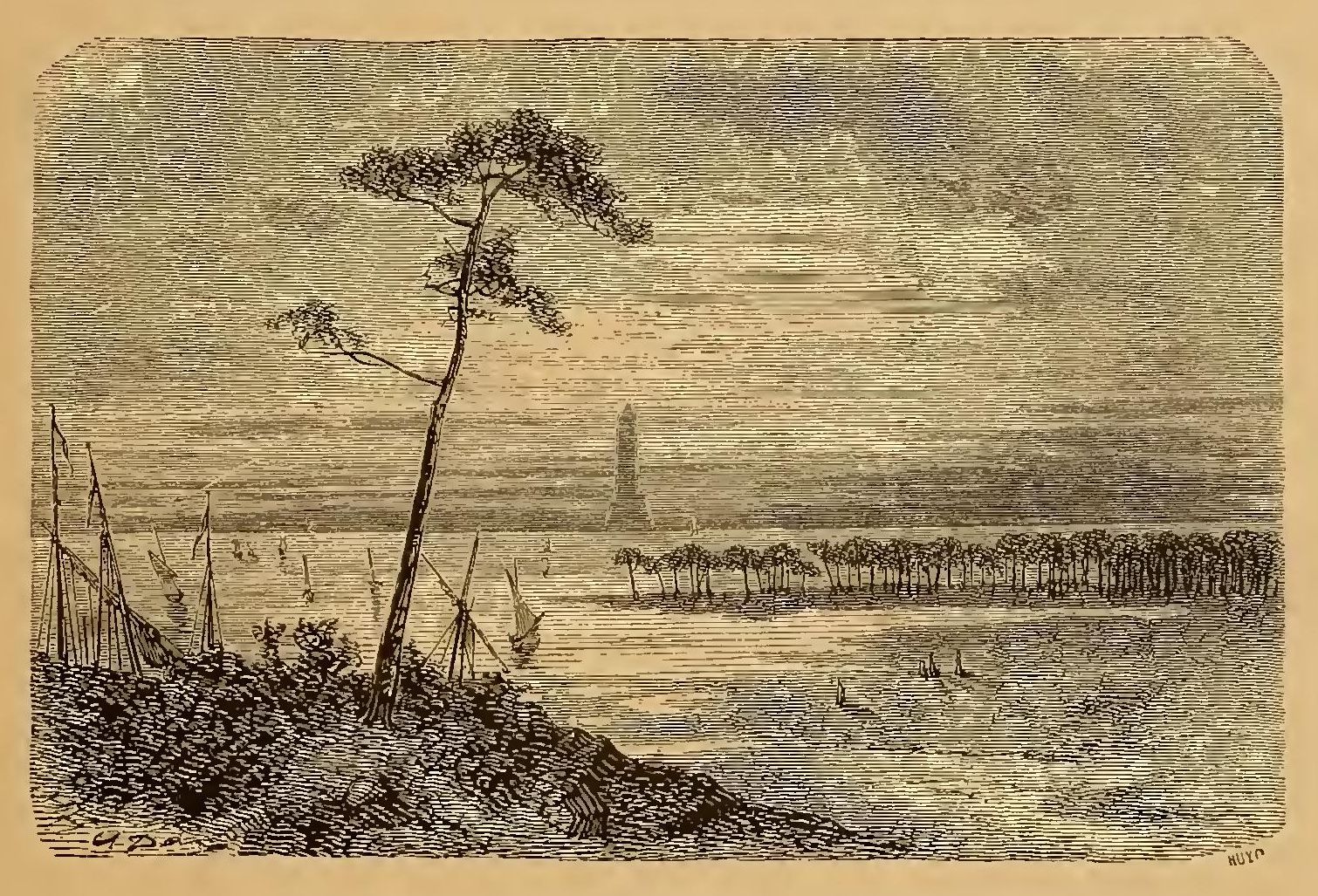 At the left of the village, a footpath winds to the summit of a wasted bank, among billows of standing grasses. The river is so broad that the other shore is not distinguishable. The sea, its neighbor, imparts its refluence; its long undulations come one after another against the coast, and pour their little cascades of foam upon the sand; then the water retires, running down the slope until it meets a new wave coming up which covers it; these billows are never wearied, and their come and go remind one of the regular [010]breathing of a slumbering child. For night has fallen, the tints of purple grow brown and fade away. The river goes to rest in the soft, vague shadow; scarcely, at long intervals, a remnant glimmer is reflected from a slanting wave; obscurity drowns everything in its vapory dust; the drowsy eye vainly searches in this mist some visible point, and distinguishes at last, like a dim star, the lighthouse of Cordouan.