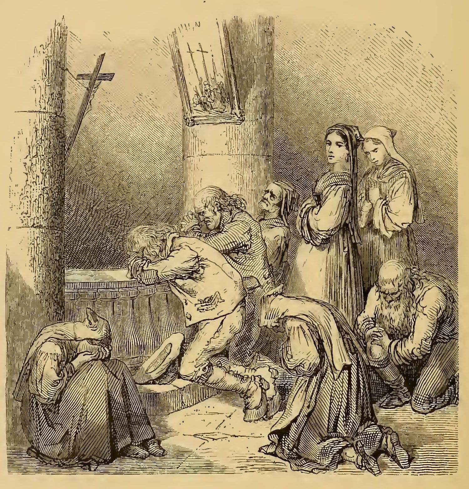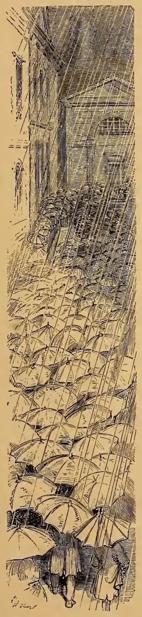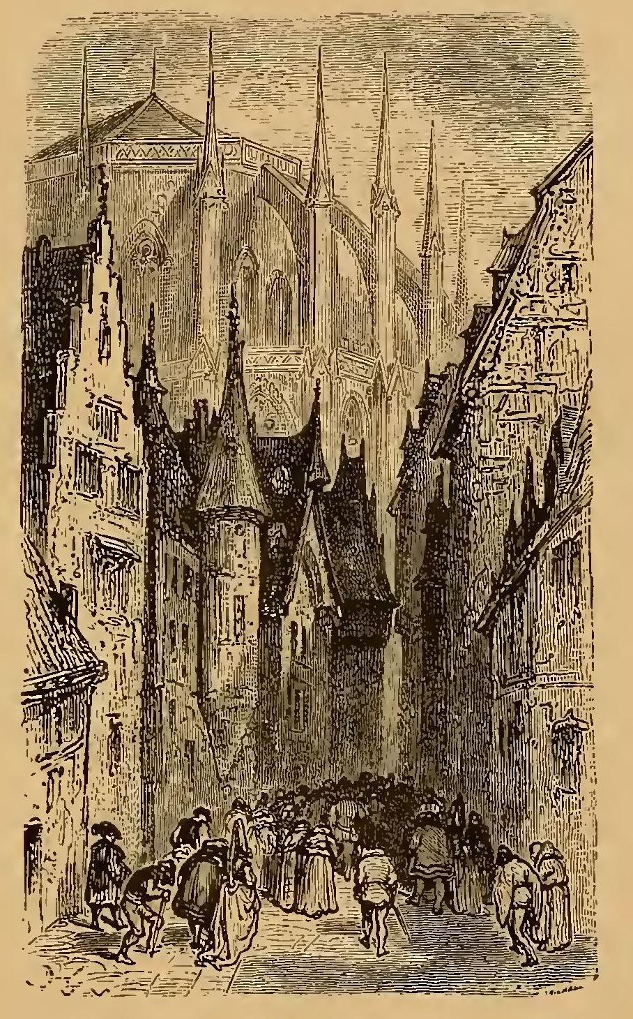 A pretty episcopal palace, in its modern elegance, makes the ugly cathedral still uglier. The poor, abortive monument piteously lifts its belfry, that for three centuries has remained but a stump. Booths are stuck in its hollows, after the manner of warts; here and there they have laid on a rude plaster of stone. The old invalid is a sad spectacle alongside of the new houses and busy shops which crowd around its grimy flanks. [018]I was quite troubled at this decrepitude, and when once I had entered, I became still more melancholy. Darkness fell from the vault like a winding-sheet; I could make out nothing but o o worm-eaten pillars, smoke-darkened pictures, expanses of greenish wall. Two fresh toilettes that I met increased the contrast; nothing could shock one more in this place than rose-colored ribbons.