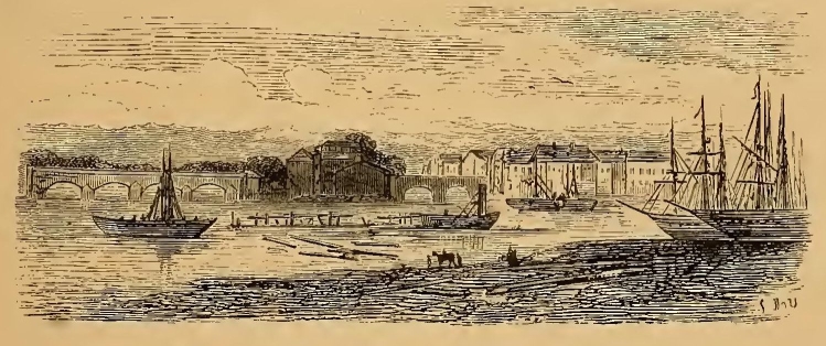 The next evening, a fresh sea-breeze has brought us to Bordeaux. The enormous city heaps its monumental houses along the river like bastions; the red sky is embattled by their coping. They on one hand, the bridge on the other, protect, with a double line, the port where the vessels [011]are crowded together like a flock of gulls; those graceful hulls, those tapering masts, those sails swollen or floating, weave the labyrinth of their movements and forms upon the magnificent purple of the sunset. The sun sinks down into the midst of the river and sets it all ablaze; the black rigging, the round hulls, stand out against its conflagration, and look like jewels of jet set in gold. [012]