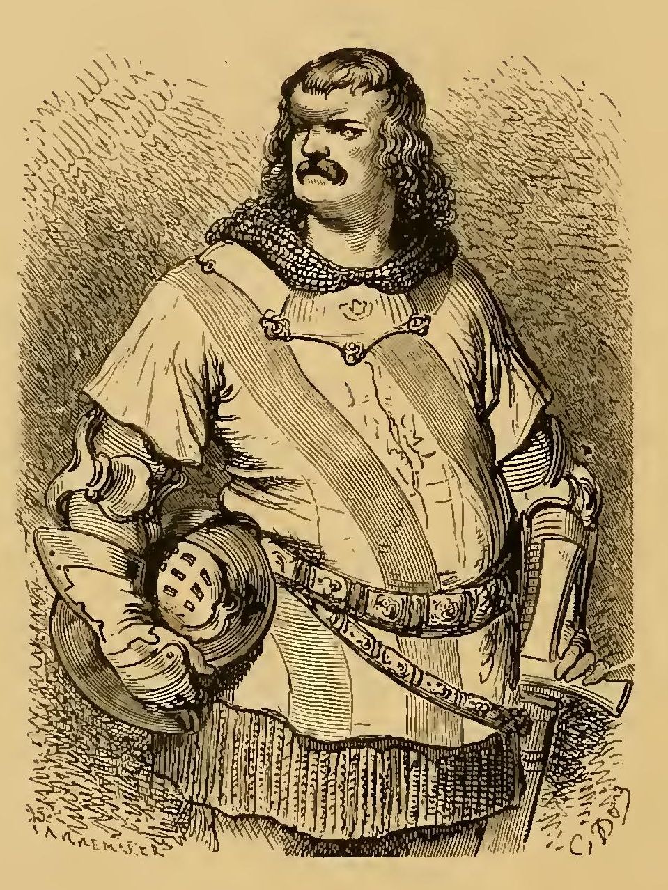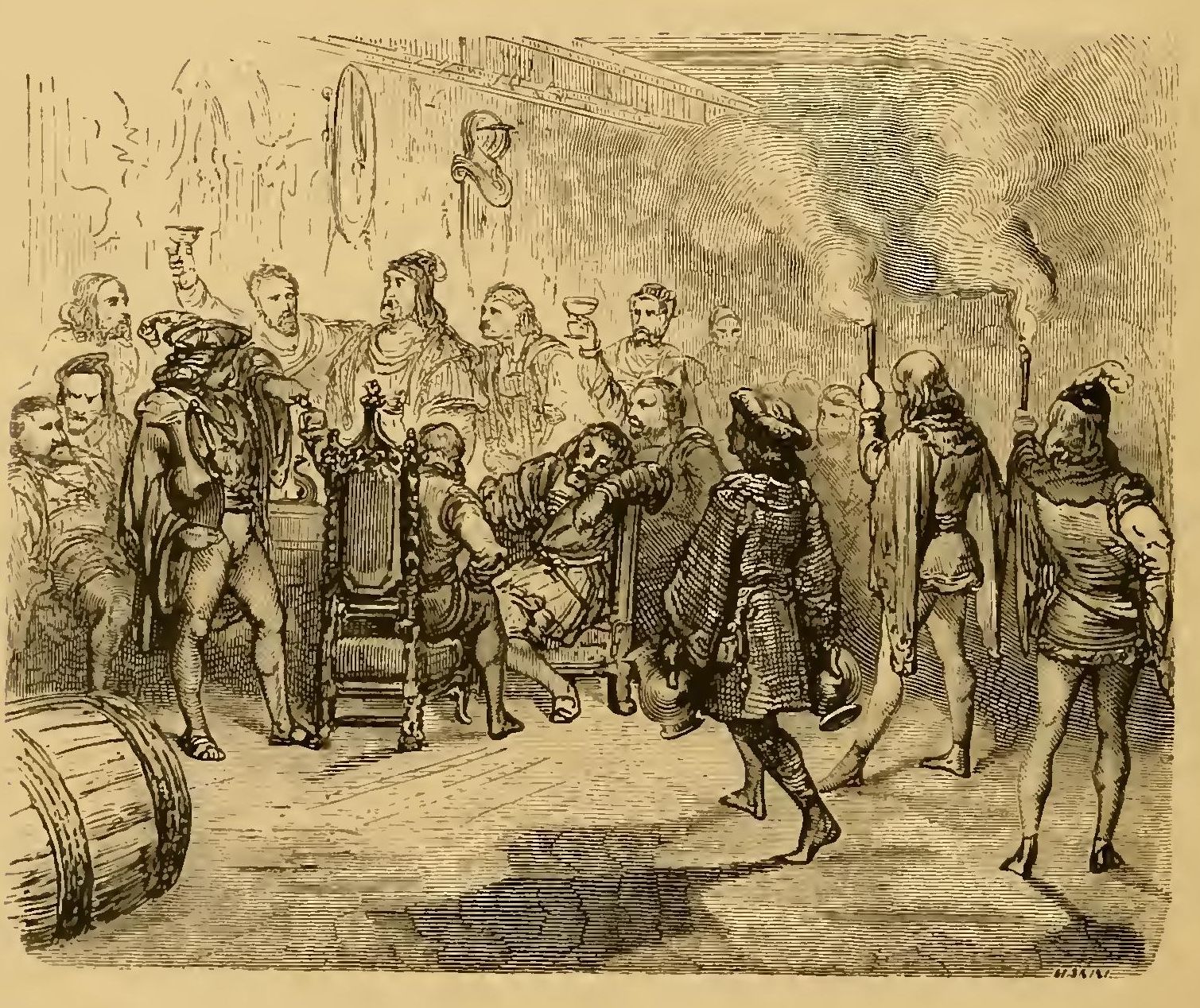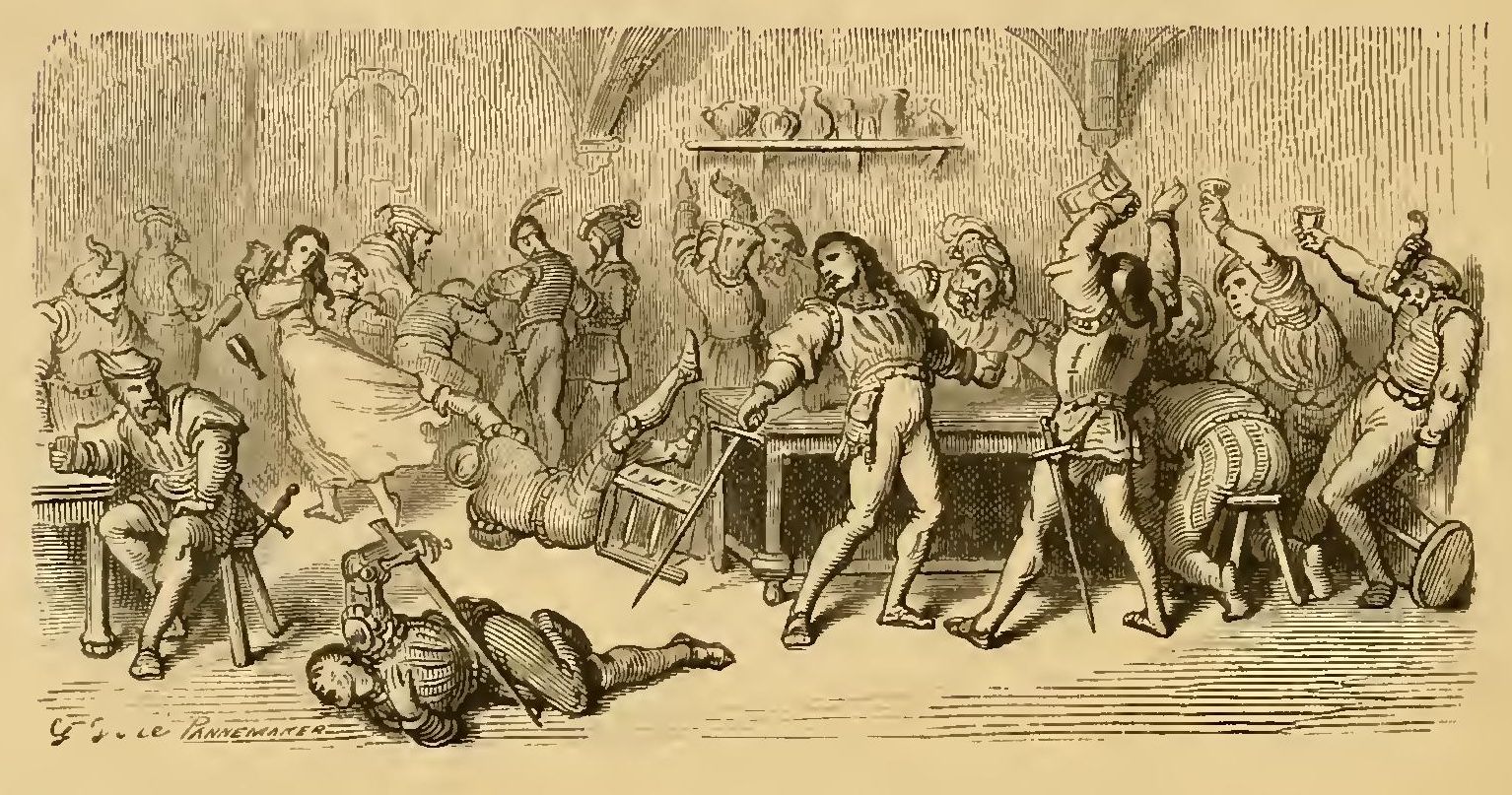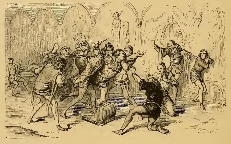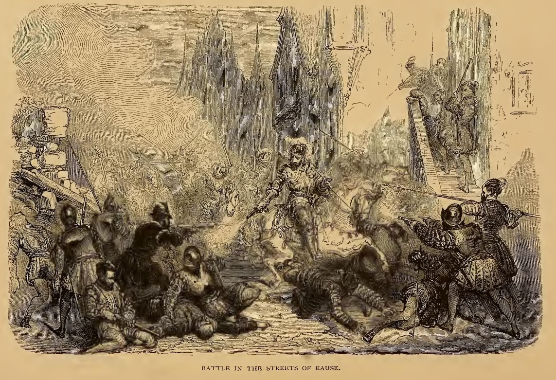 Having arrived at the castle they found the drawbridge down and the postern open, so confident and unsuspecting were the Basques, and entered, cutlasses drawn and pikes forward, into the great hall. There were killed seven young men who had barricaded themselves behind tables, and would there make sport with their dirks; but the good halberds, well pointed and sharp as they were, soon silenced them. The others, having closed the gates from within, thought that they would have power to defend themselves or time to flee; but the Bayonne marines, with their great axes, hewed down the planks, and split the first brains which happened to be near. The mayor, seeing that the Basques were tightly girt with their red sashes, went about saying (for he was usually facetious on days of battle): “Lard these fine gallants for me; forward the spit into their flesh justicoats;” and in fact the spits went forward, so that all were perforated and opened, some through and through, so that you might have seen daylight through them, and that the hall half an hour after was full of pale and red bodies, several bent over benches, others in a pile in the corners, some with their noses glued to the table like drunkards, [025] so that a Bayonnais, looking at them, said: “This is the veal market.” Many, pricked from behind, had leaped through the windows, and were found next morning, with cleft head or broken spine, in the ditches.