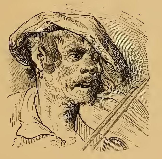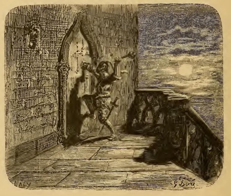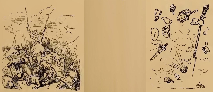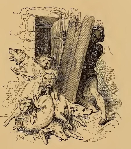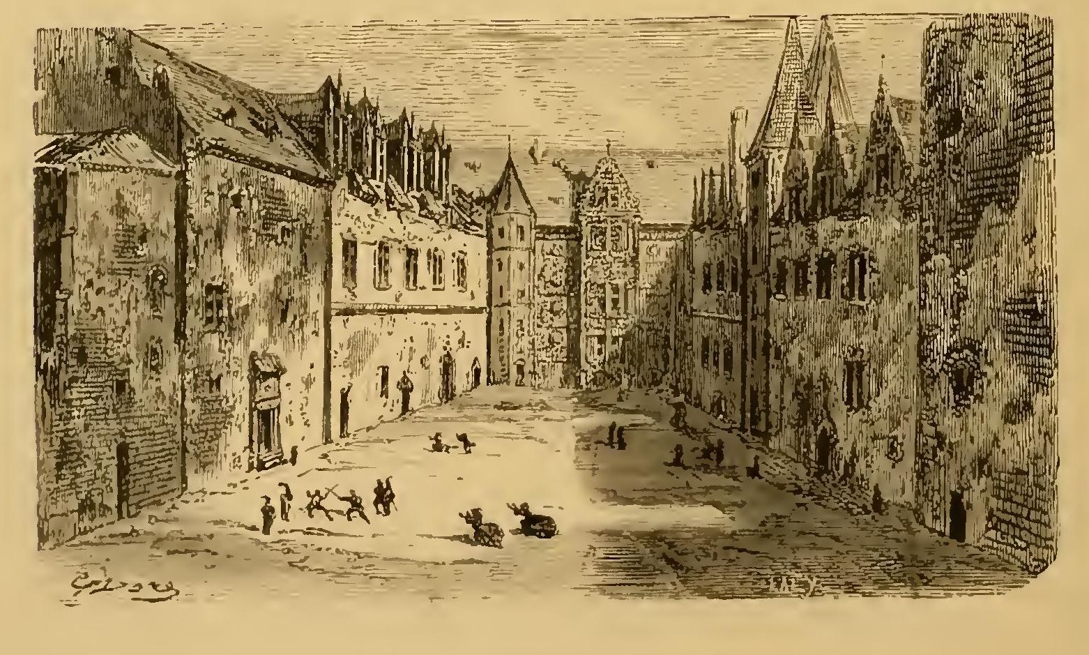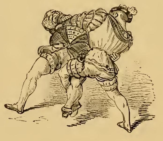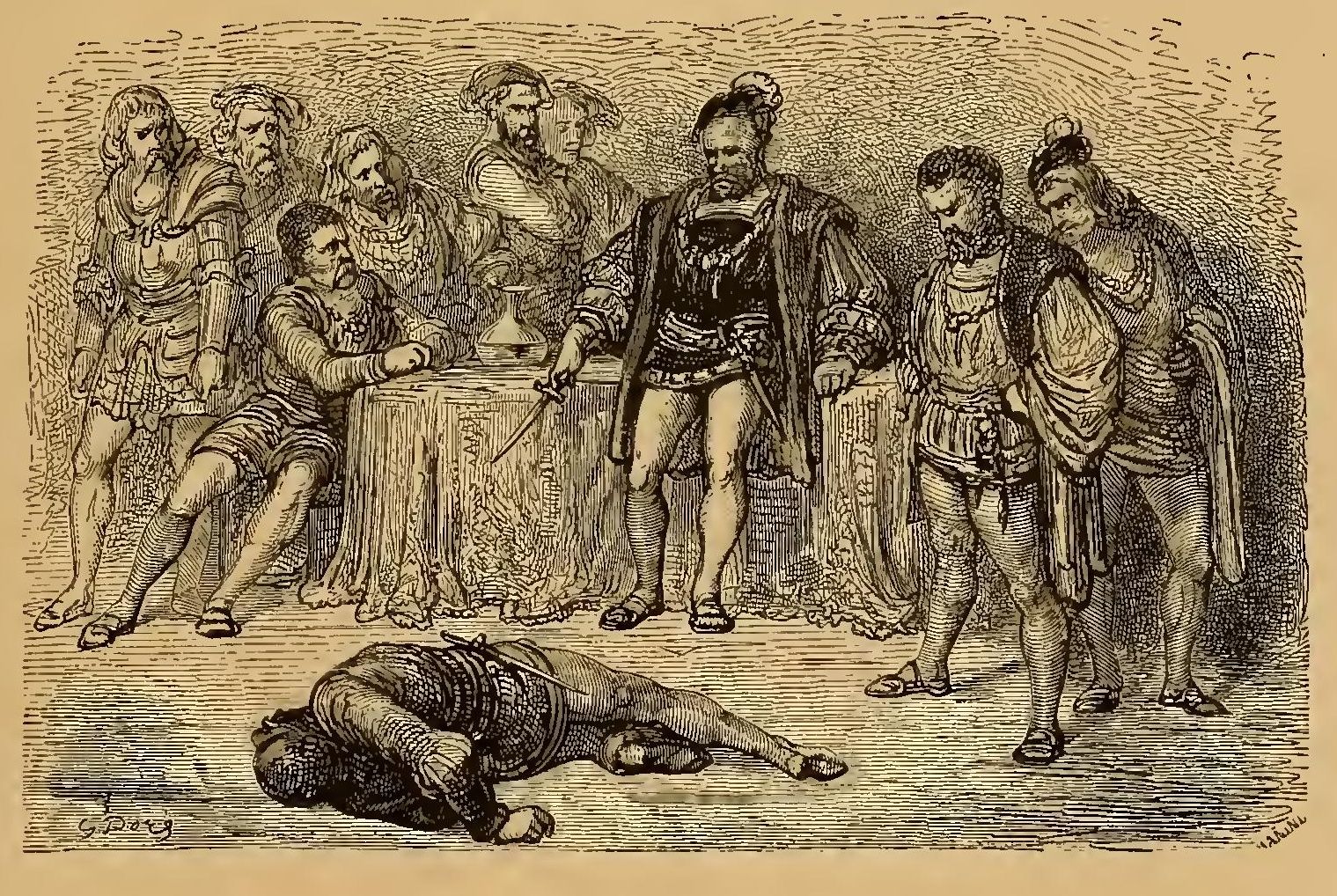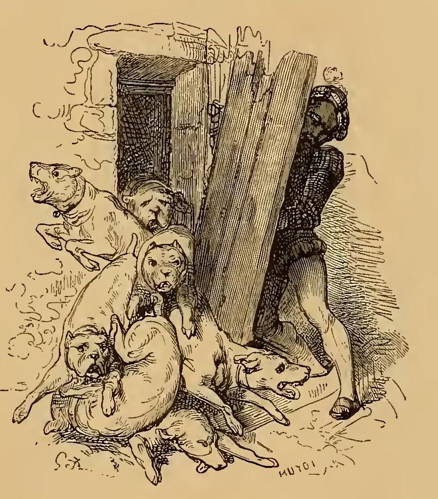 Having arrived at the castle they found the drawbridge down and the postern open, so confident and unsuspecting were the Basques, and entered, cutlasses drawn and pikes forward, into the great hall. There were killed seven young men who had barricaded themselves behind tables, and would there make sport with their dirks; but the good halberds, well pointed and sharp as they were, soon silenced them. The others, having closed the gates from within, thought that they would have power to defend themselves or time to flee; but the Bayonne marines, with their great axes, hewed down the planks, and split the first brains which happened to be near. The mayor, seeing that the Basques were tightly girt with their red sashes, went about saying (for he was usually facetious on days of battle): “Lard these fine gallants for me; forward the spit into their flesh justicoats;” and in fact the spits went forward, so that all were perforated and opened, some through and through, so that you might have seen daylight through them, and that the hall half an hour after was full of pale and red bodies, several bent over benches, others in a pile in the corners, some with their noses glued to the table like drunkards, [025] so that a Bayonnais, looking at them, said: “This is the veal market.” Many, pricked from behind, had leaped through the windows, and were found next morning, with cleft head or broken spine, in the ditches.